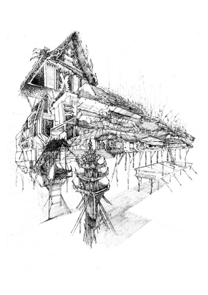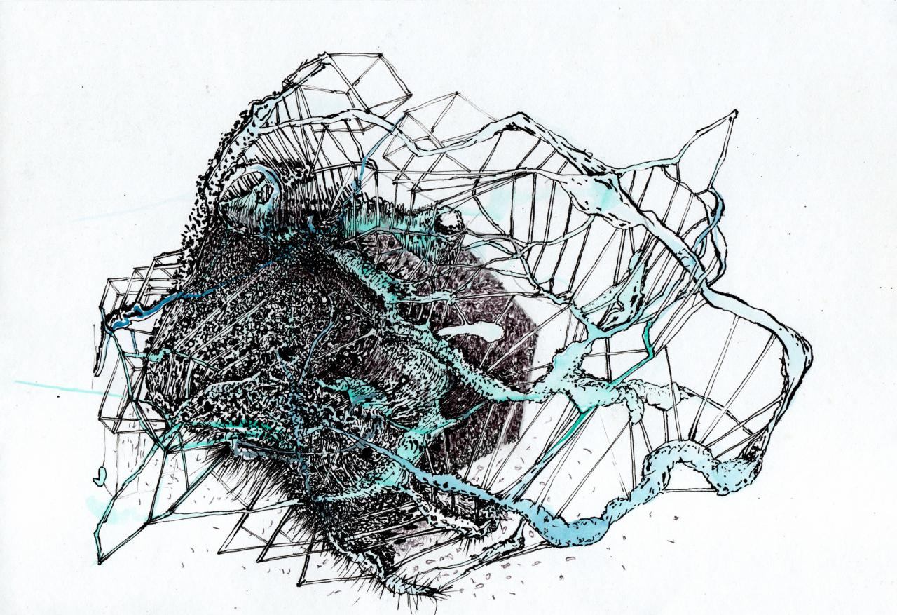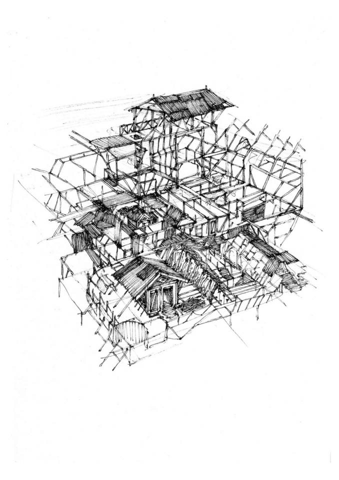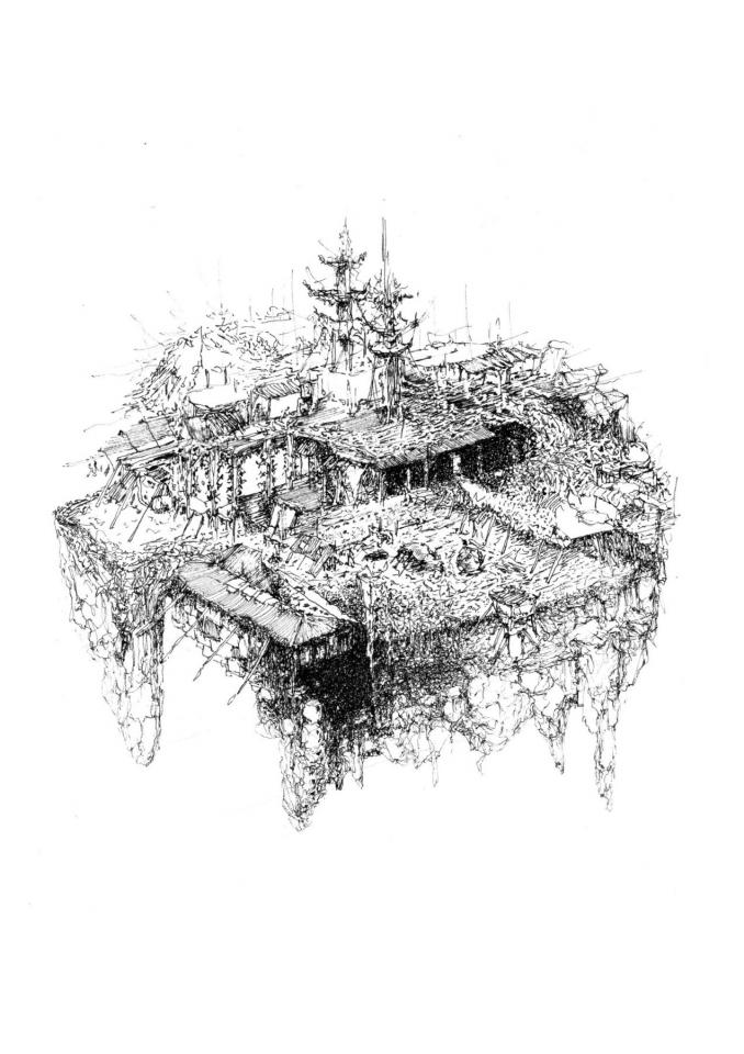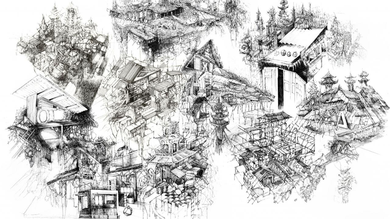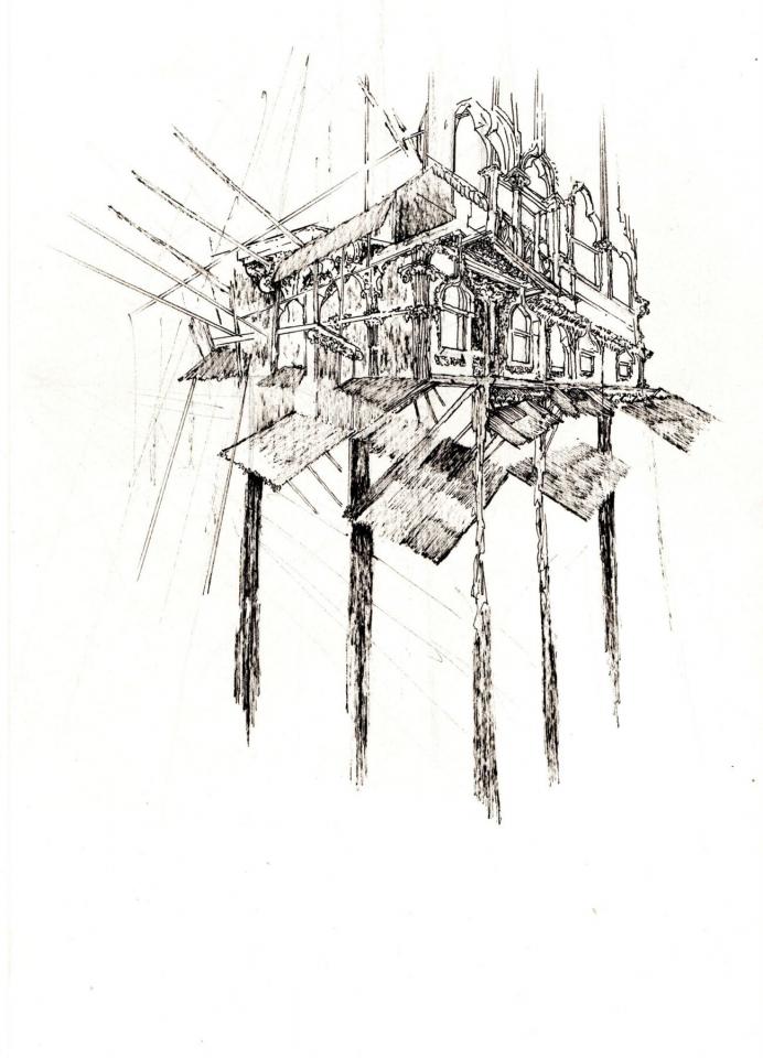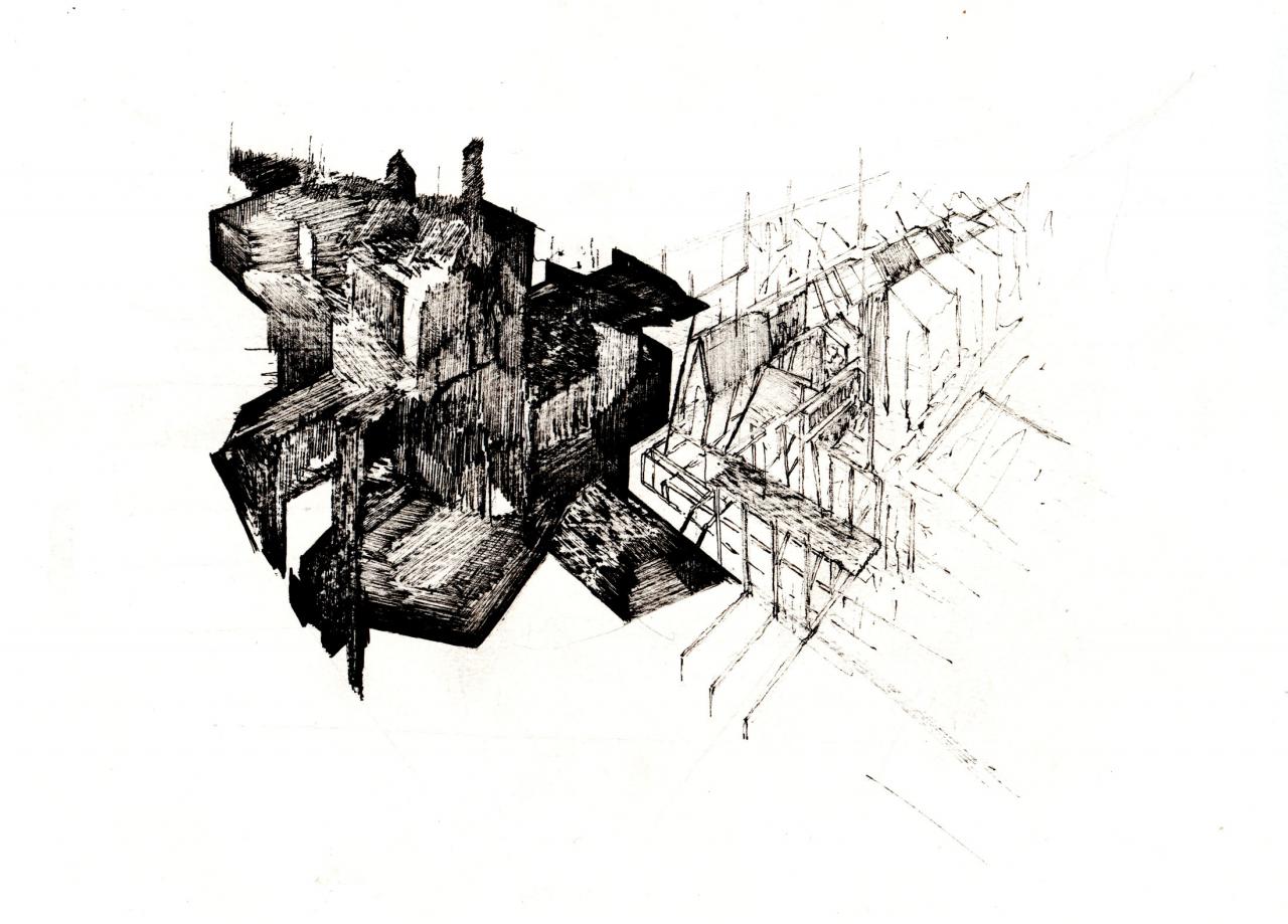 « (…) Pour C’EST UN GRAND TERRAIN DE NULLE PART, tout est parti de croquis de lieux imaginaires que j’ai combinés avec des croquis de détails de lieux réels que j’avais visités (usines, temples, cases créoles abandonnées…). Je les dessinais souvent sur place, rapidement, de façon nerveuse, puis j’en sélectionnais certaines parties pour les retravailler et les assembler à d’autres, comme si je travaillais avec des calques. Peu à peu, une nouvelle étape s’est imposée : une extension des dessins à travers la vidéo d’animation 2D et 3D. Je me suis demandé : qu’est-ce que ça ferait de voir ces lieux, ces architectures dessinées s’animer et prendre vie ? L’idée d’une architecture vivante — au sens d’animée ou habitée par un esprit — m’a toujours fasciné. Qu’il s’agisse du cinéma (Amityville, Poltergeist, Playtime, One Week, Mon Oncle, Shining) ou de l’écriture (Les Cités obscures de Schuiten, Ici de Richard McGuire, ou le roman La Maison des feuilles), je reste profondément attiré par le motif de la maison vivante.