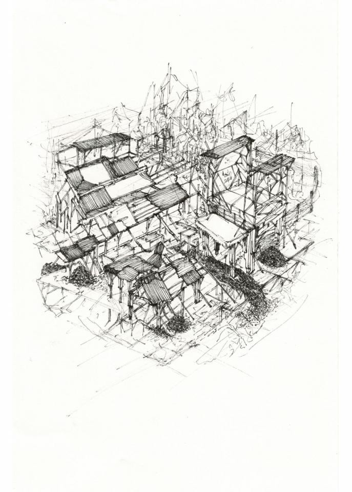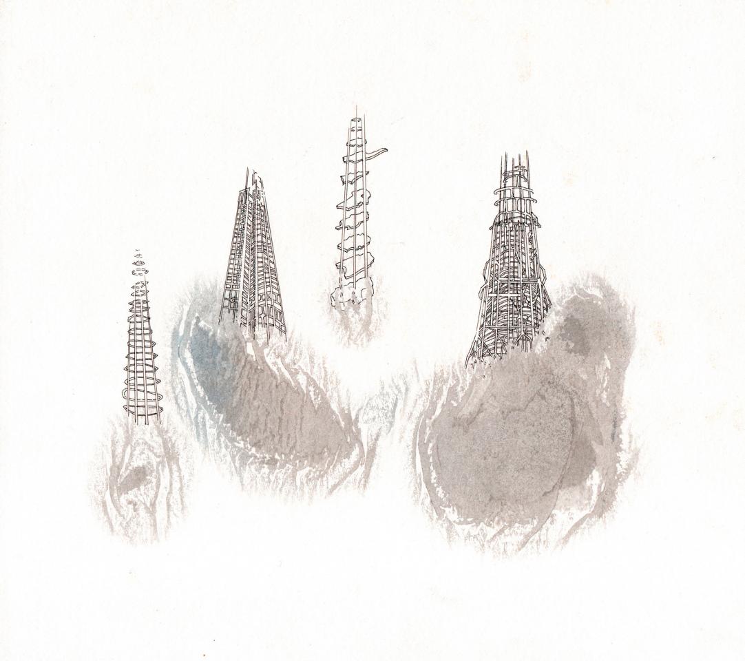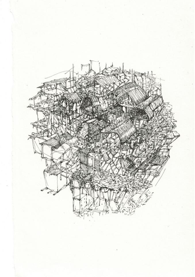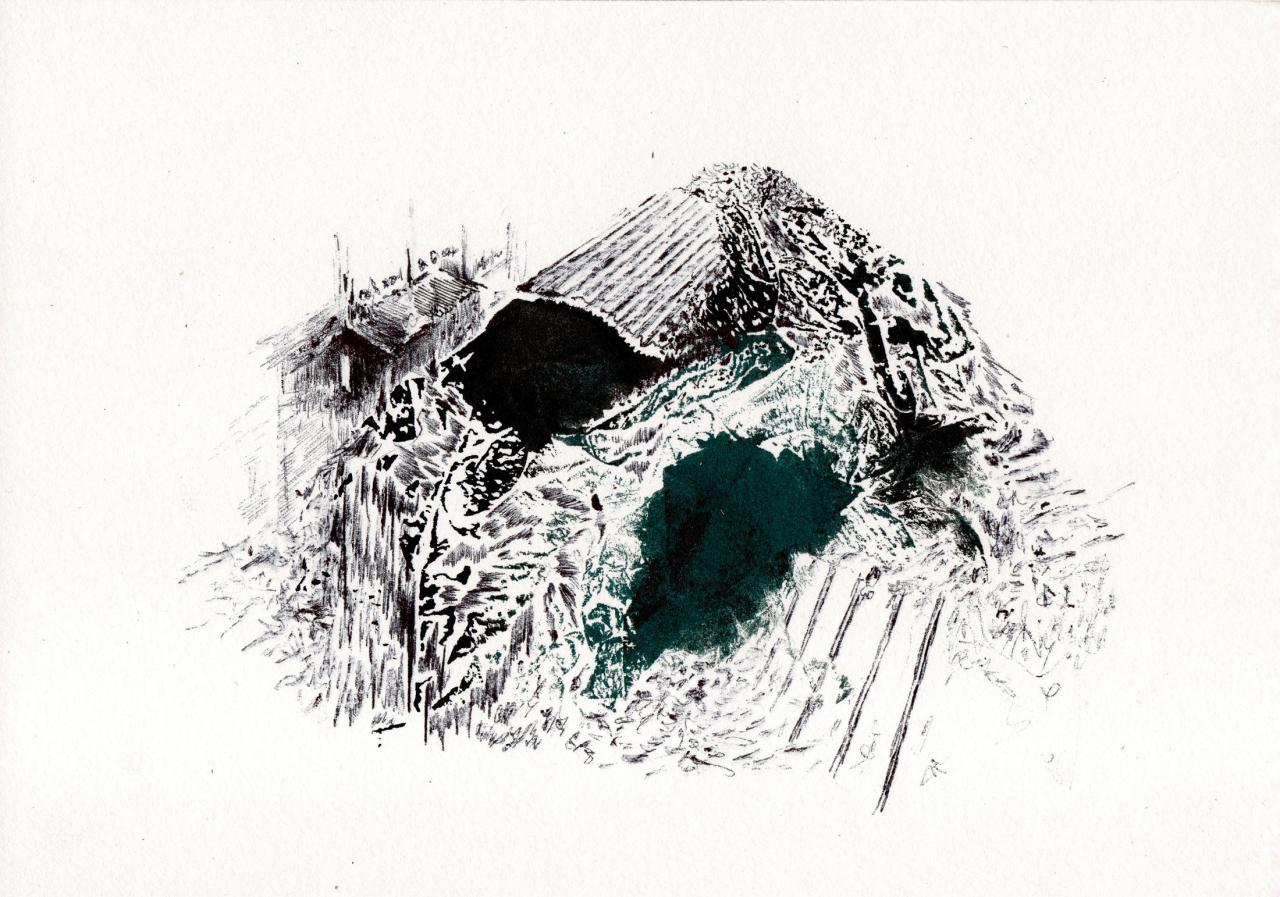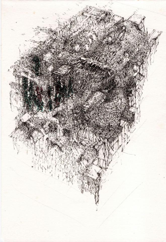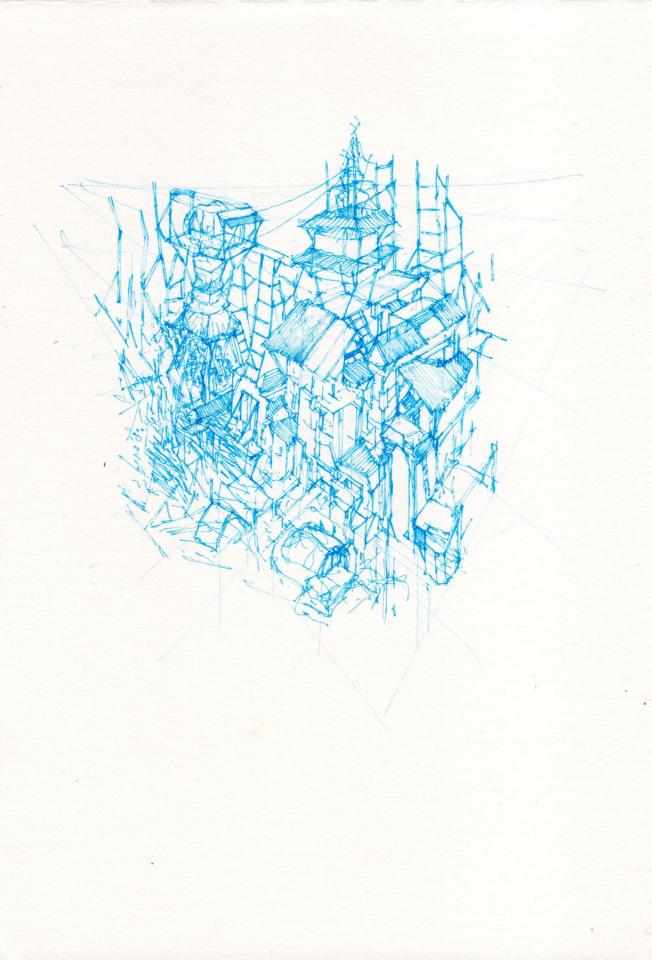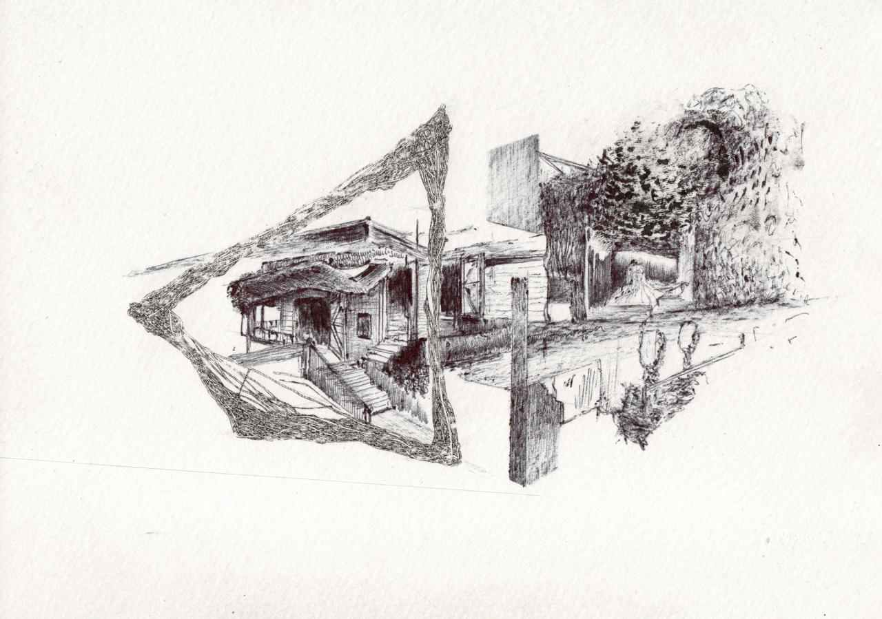 « La série “ C’est un grand terrain de nulle part ” (CUGTDNP) est un ensemble composé initialement de dessins commencés en 2006, la plupart du temps réalisés dans un carnet de croquis d’environ 15 x 20 cm, chez moi ou durant mes voyages (2006 en France, 2019 en Thaïlande…), augmenté au fur et à mesure par des vidéos, transformant ce grand terrain de nulle part en lieu infini composé de souvenirs réels ou inventés. Le titre est emprunté de la chanson de Gérard Manset Comme un Lego. Cases, ruines, usines, villages, temples, autels, vérandas, échafaudages, chantiers, déchetteries, rochers, forêts, coraux… fouiller le réel dans ses détails, et dessiner ce qui reste. »