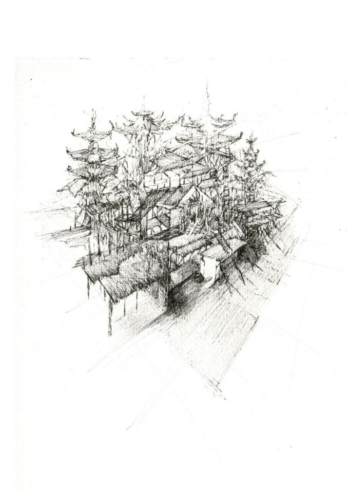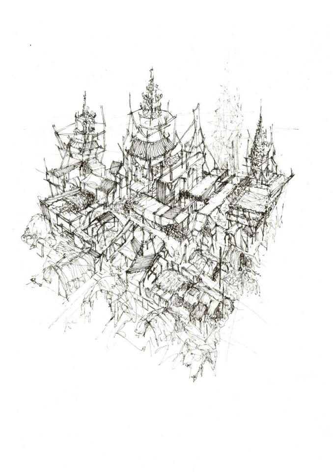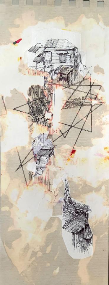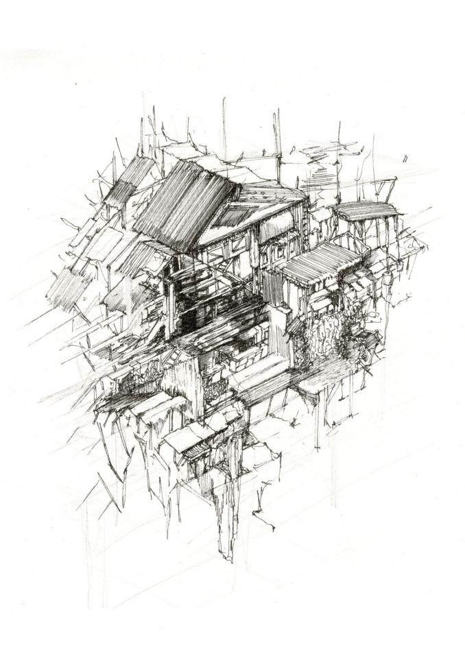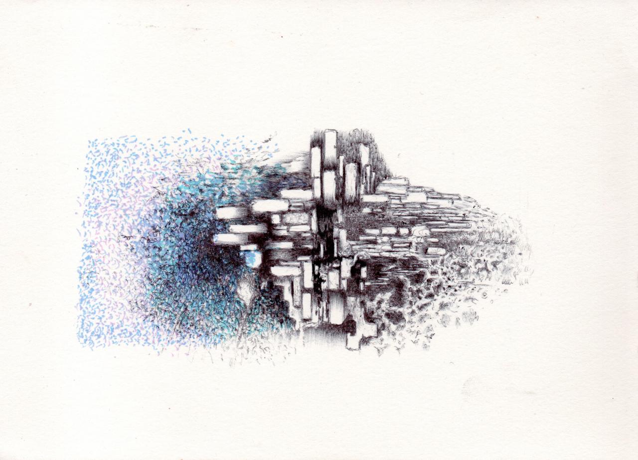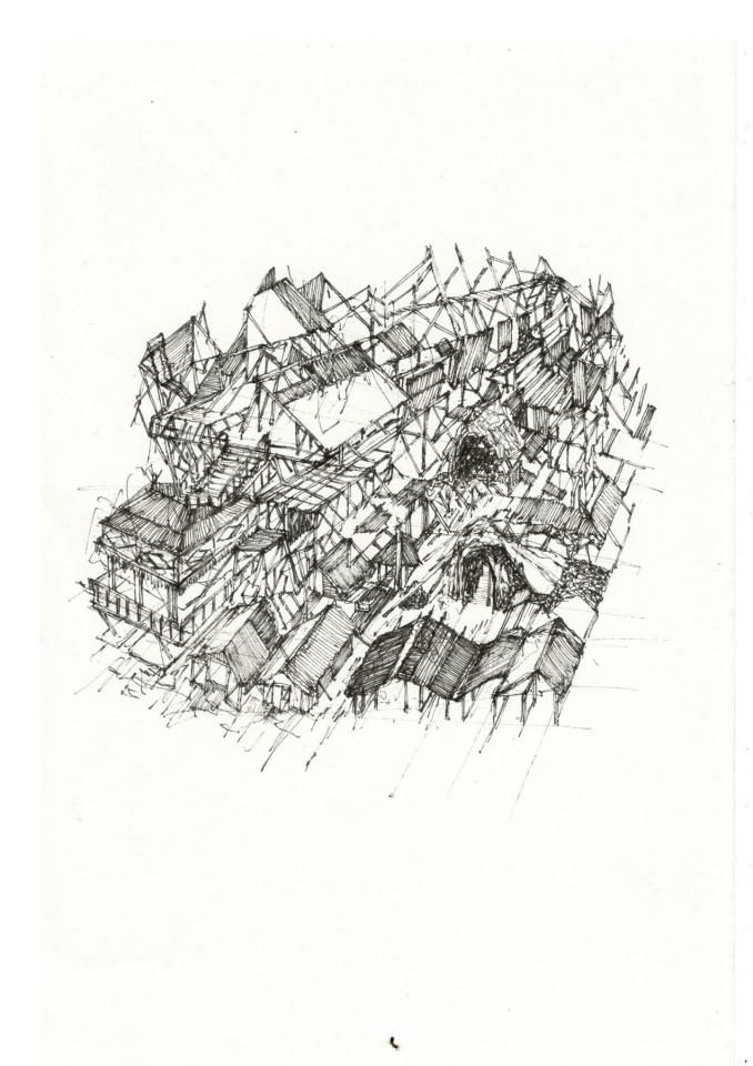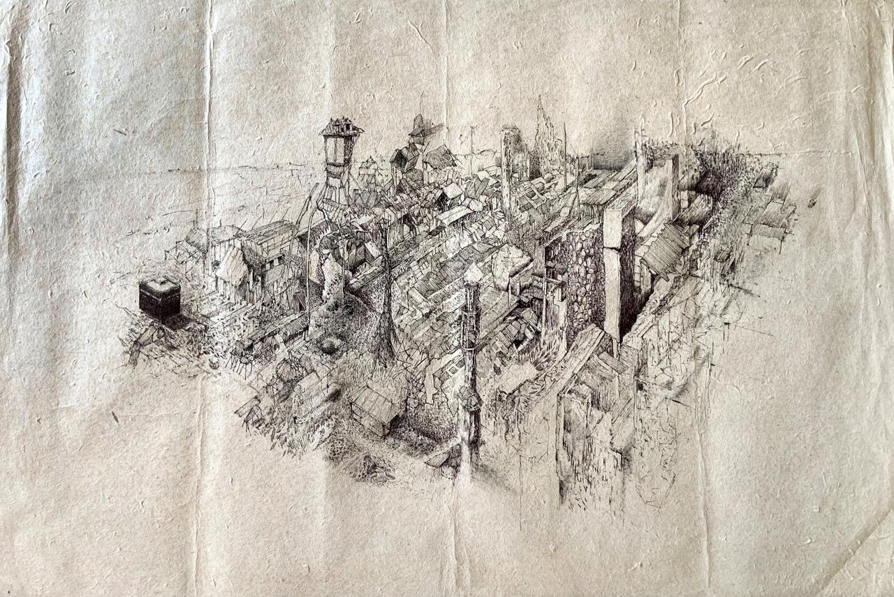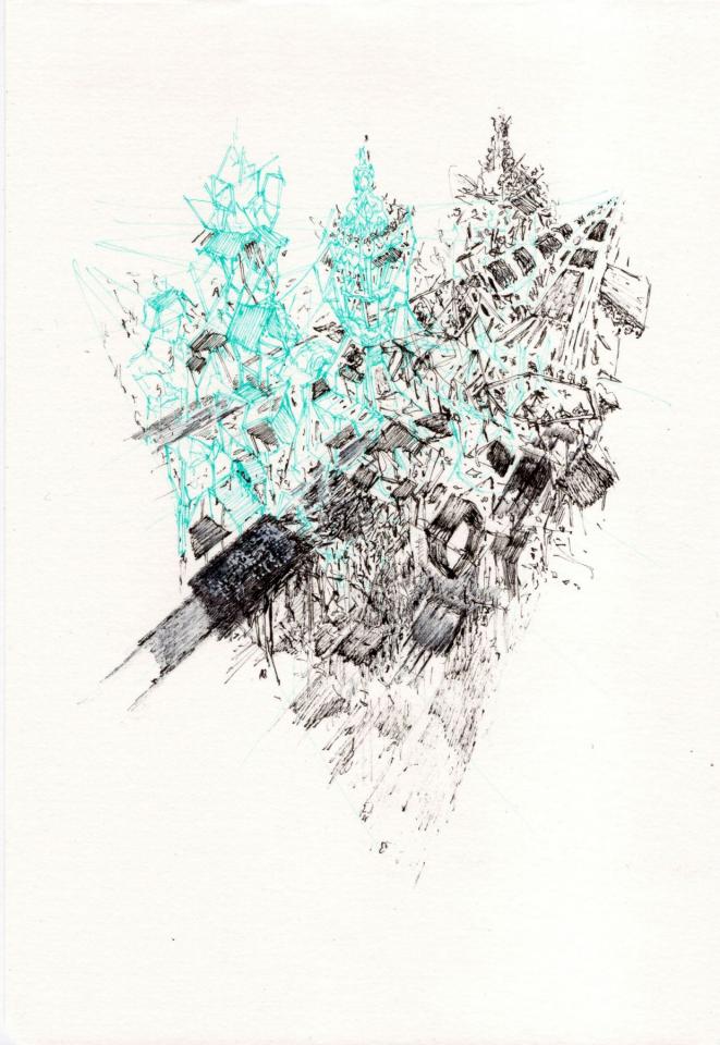 « La série “ C’est un grand terrain de nulle part ” (CUGTDNP) est un ensemble composé initialement de dessins commencés en 2006, la plupart du temps réalisés dans un carnet de croquis d’environ 15 x 20 cm, chez moi ou durant mes voyages (2006 en France, 2019 en Thaïlande…), augmenté au fur et à mesure par des vidéos, transformant ce grand terrain de nulle part en lieu infini composé de souvenirs réels ou inventés. Le titre est emprunté de la chanson de Gérard Manset Comme un Lego. Cases, ruines, usines, villages, temples, autels, vérandas, échafaudages, chantiers, déchetteries, rochers, forêts, coraux… fouiller le réel dans ses détails, et dessiner ce qui reste. »