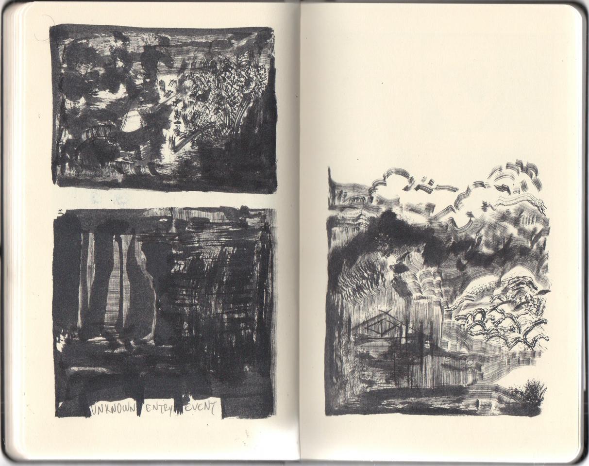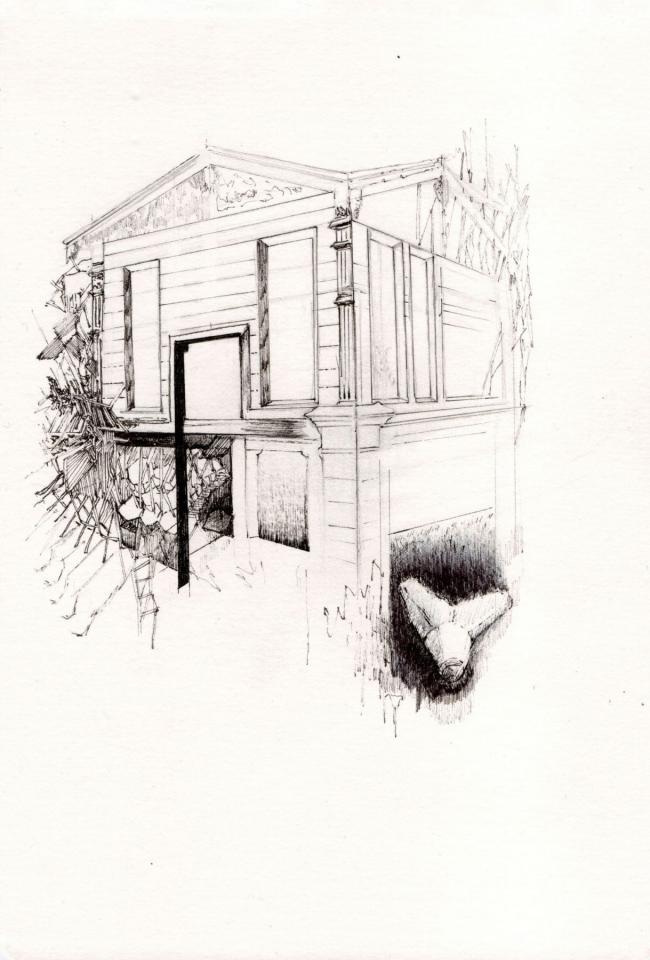 Pour C’EST UN GRAND TERRAIN DE NULLE PART, tout est parti de croquis de lieux imaginaires que j’ai combinés avec des croquis de détails de lieux réels que j’avais visités (usines, temples, cases créoles abandonnées…). Je les dessinais souvent sur place, rapidement, de façon nerveuse, puis j’en sélectionnais certaines parties pour les retravailler et les assembler à d’autres, comme si je travaillais avec des calques. Peu à peu, une nouvelle étape s’est imposée : une extension des dessins à travers la vidéo d’animation 2D et 3D. Je me suis demandé : qu’est-ce que ça ferait de voir ces lieux, ces architectures dessinées s’animer et prendre vie ? L’idée d’une architecture vivante — au sens d’animée ou habitée par un esprit — m’a toujours fasciné. Qu’il s’agisse du cinéma (Amityville, Poltergeist, Playtime, One Week, Mon Oncle, Shining) ou de l’écriture (Les Cités obscures de Schuiten, Ici de Richard McGuire, ou le roman La Maison des feuilles), je reste profondément attiré par le motif de la maison vivante.