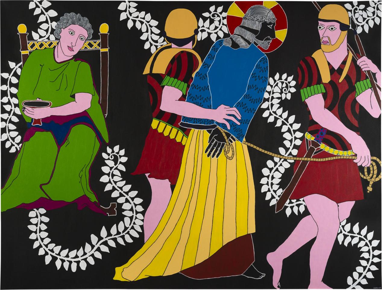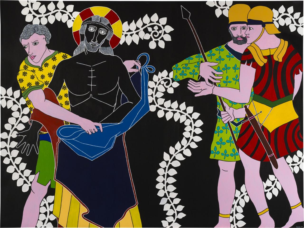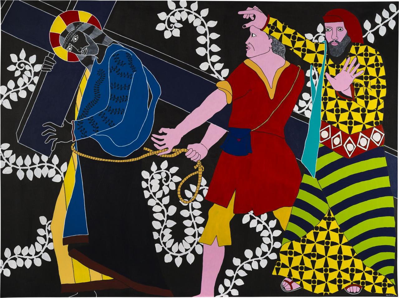 « Quelle mouche pique Stéphane Kenkle pour qu’il décide de peindre un chemin de croix en plein XXIe siècle, sans commande ni illumination pour motif ? Pour qu’il décide de consacrer 15 mois de son temps et de sa vie à la mise en scène des quatorze stations du calvaire de Jésus de Nazareth, seul, en grands formats et grands aplats ? À l’en croire, c’est le souvenir enluminé de gravures ou plus simplement encore de pieuses images divulguées au cours de séances de catéchisme qui l’a guidé depuis l’enfance jusqu’à cette exposition. L’enfance donc pendant laquelle l’image est un langage au moins égal au verbe. Et si ce retour à l’enfance de l’art emmitouflait dans sa mante quelque réminiscence médiévale, naïve et puissamment symbolique ? Et si on s’autorisait à voir dans l’énervement de la liane, le rythme du motif et le choix du bleu transfiguré en rouge à la Station 10, le retour d’un refoulé moyenâgeux, poétique et direct ? Il me plairait bien à moi, de rêver d’héraldique, de couleurs aux significations doubles, de profils dramatiques, de figures symboliques, de peintures à la fresque en me promenant au milieu des scènes flottantes de ce chemin en croix. Et si je me laissais vraiment aller, voici ce que j’entendrais…