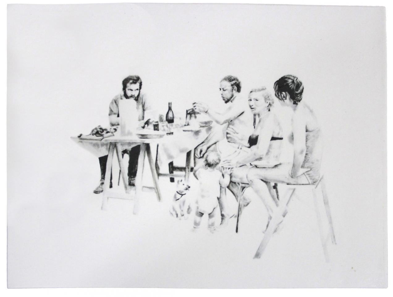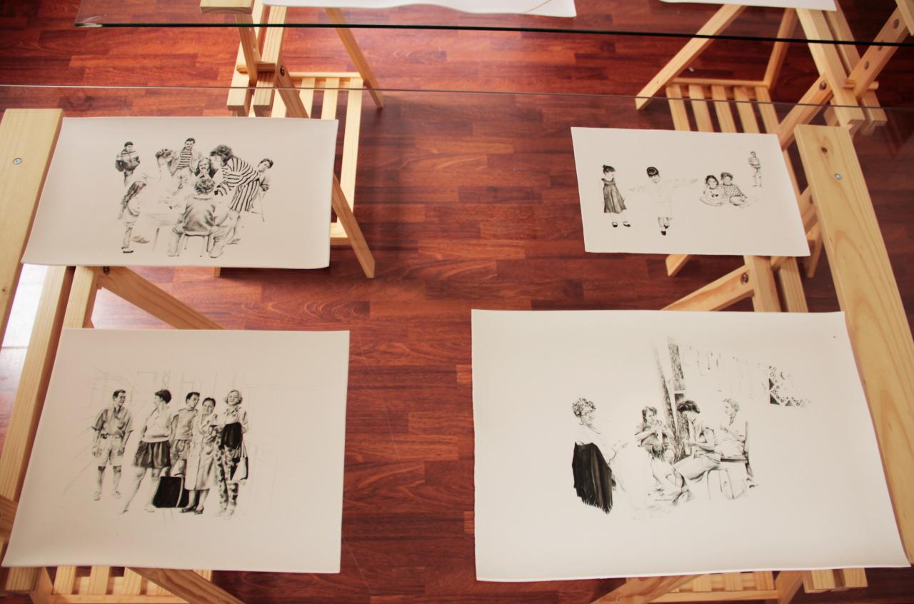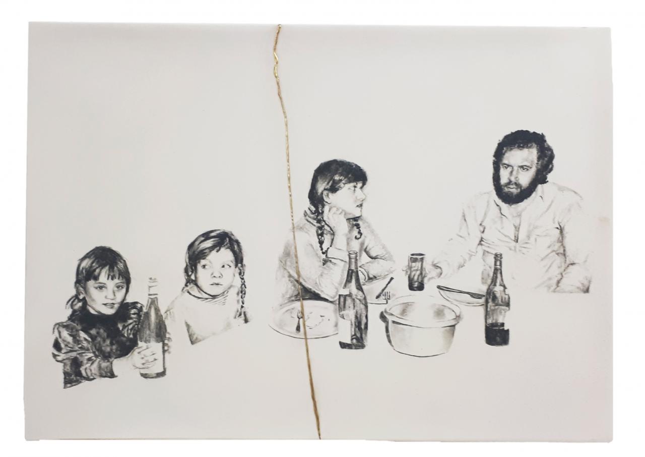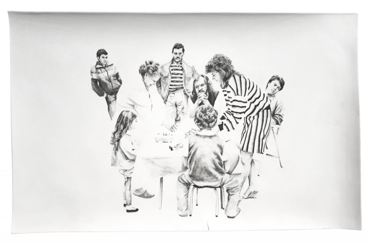 Les titres sont légers et innocents comme l’enfance : Repas de famille ou À la pêche, mais le ton oscille entre légèreté et gravité, car le dessin recrée des situations ambiguës à partir de ces photos-souvenirs, un moment heureux ou malheureux, des atmosphères familiales où la situation peut être tendue, le malaise d’une sensation parfois. Mais il faut éviter le pathos, pointer le jeu des regards, souligner cet homme aux yeux perdus dans le vague, la présence de l’alcool, une jeune mère enamourée, il faut retrouver dans chaque image l’histoire d’une famille et la mettre à distance, réinventer des scènes montrant la complexité des relations familiales, parler de la cruauté de l’enfance, des tensions aussi. Mais les corps semblent flotter et les rapports d’échelle paraissent parfois étranges en l’absence des décors ; restent les regards, les postures des corps mis en avant au détriment de la narration elle-même. On pense à la série de Massinissa Selmani : A-t-on besoin des ombres pour se souvenir ? L’artiste affirme : “Ce qui m’intéresse dans le dessin, c’est qu’il donne une certaine autonomie. (…) Il y a une dimension documentaire dans le dessin.”