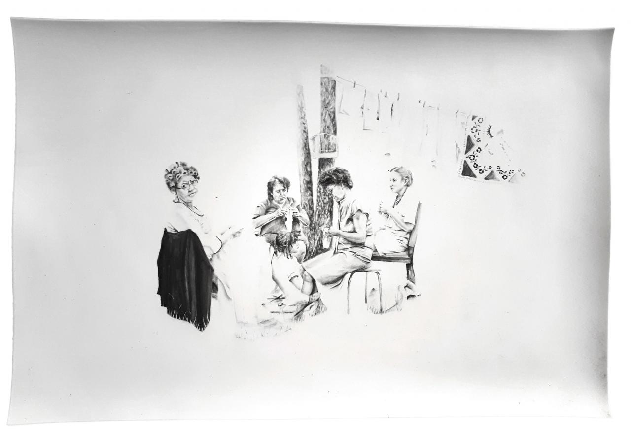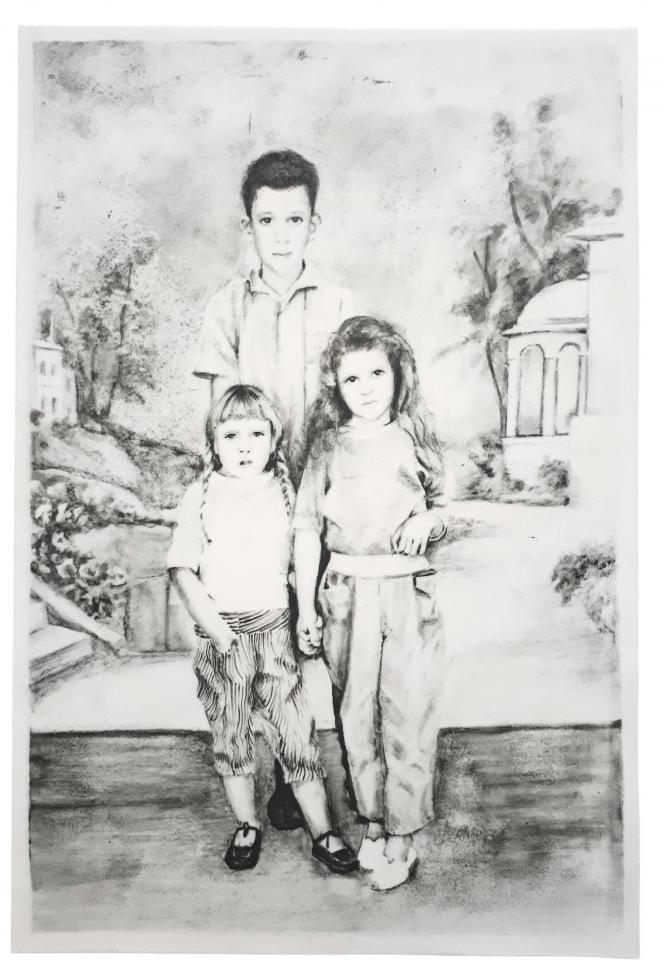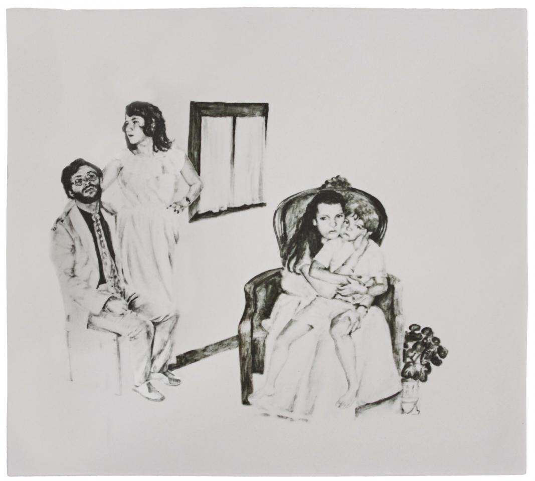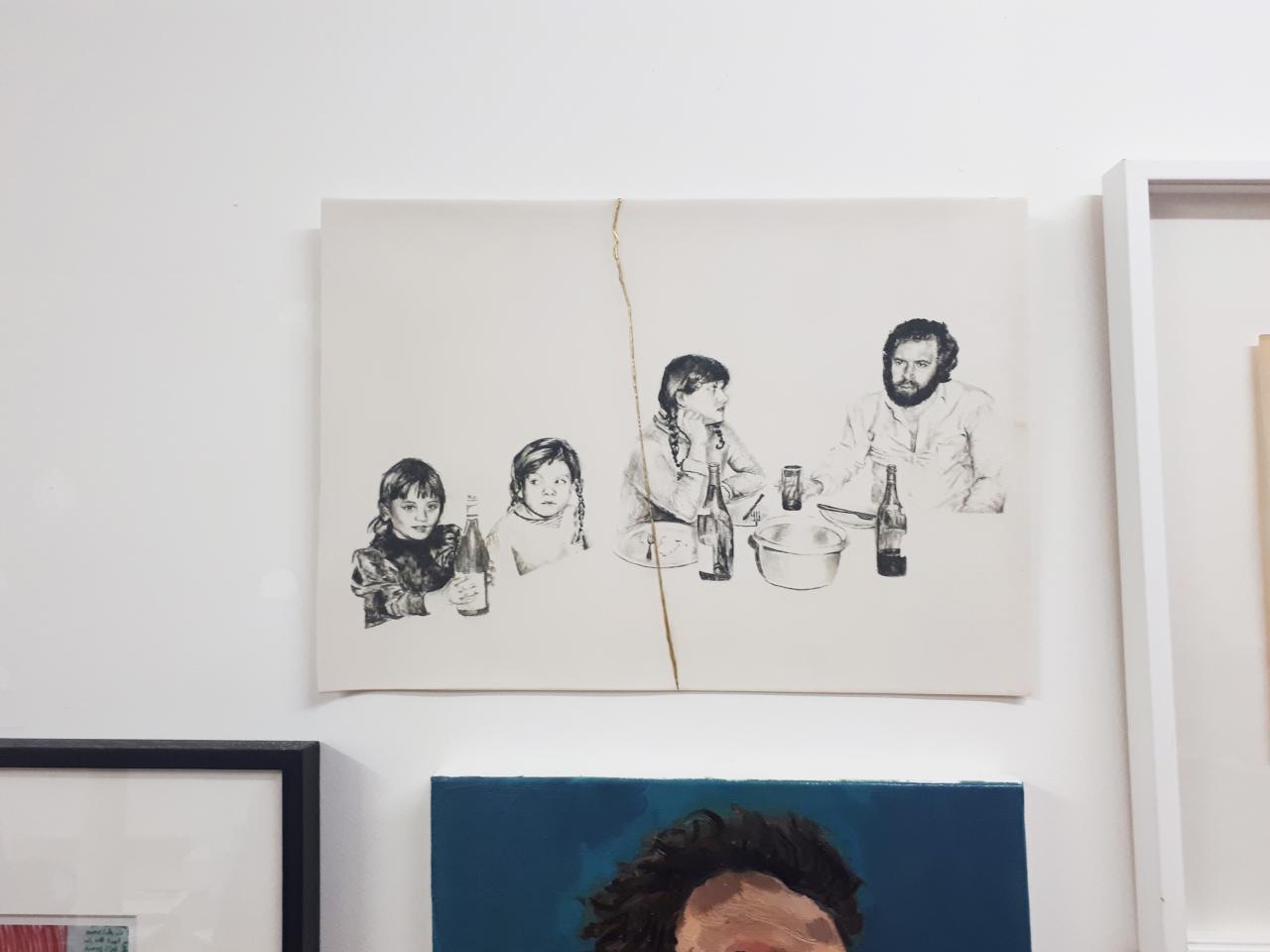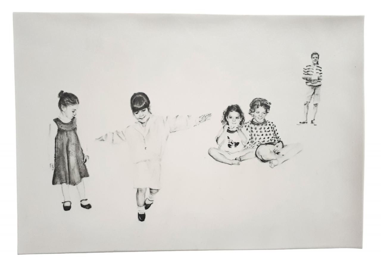Les titres sont légers et innocents comme l’enfance : Repas de famille ou À la pêche, mais le ton oscille entre légèreté et gravité, car le dessin recrée des situations ambiguës à partir de ces photos-souvenirs, un moment heureux ou malheureux, des atmosphères familiales où la situation peut être tendue, le malaise d’une sensation parfois. Mais il faut éviter le pathos, pointer le jeu des regards, souligner cet homme aux yeux perdus dans le vague, la présence de l’alcool, une jeune mère enamourée, il faut retrouver dans chaque image l’histoire d’une famille et la mettre à distance, réinventer des scènes montrant la complexité des relations familiales, parler de la cruauté de l’enfance, des tensions aussi. Mais les corps semblent flotter et les rapports d’échelle paraissent parfois étranges en l’absence des décors ; restent les regards, les postures des corps mis en avant au détriment de la narration elle-même. On pense à la série de Massinissa Selmani : A-t-on besoin des ombres pour se souvenir ? L’artiste affirme : “Ce qui m’intéresse dans le dessin, c’est qu’il donne une certaine autonomie. (…) Il y a une dimension documentaire dans le dessin.”