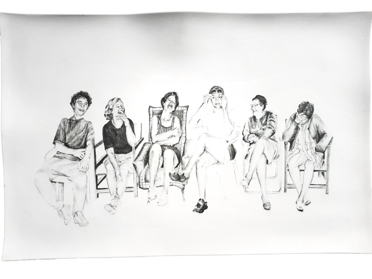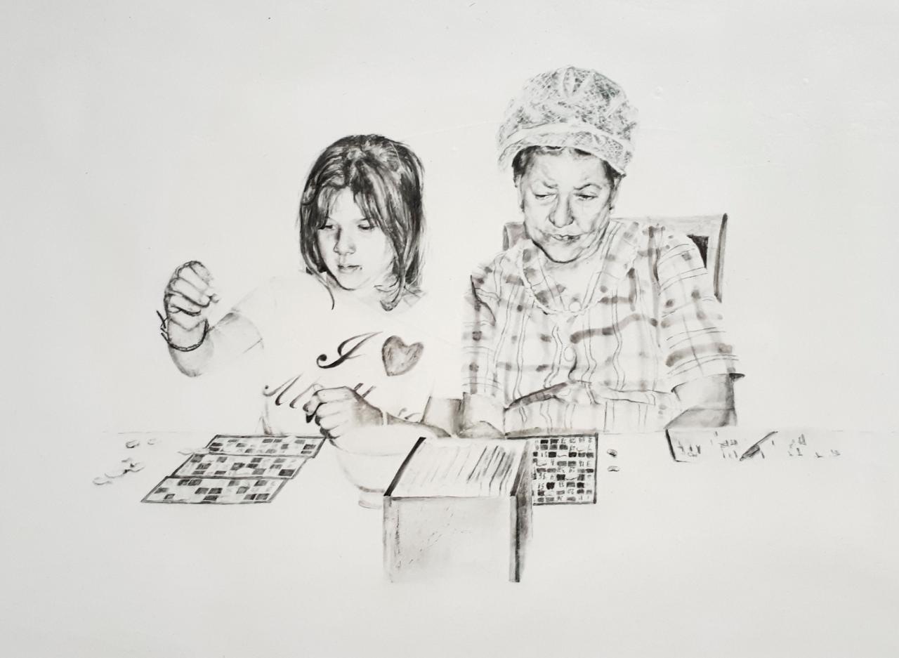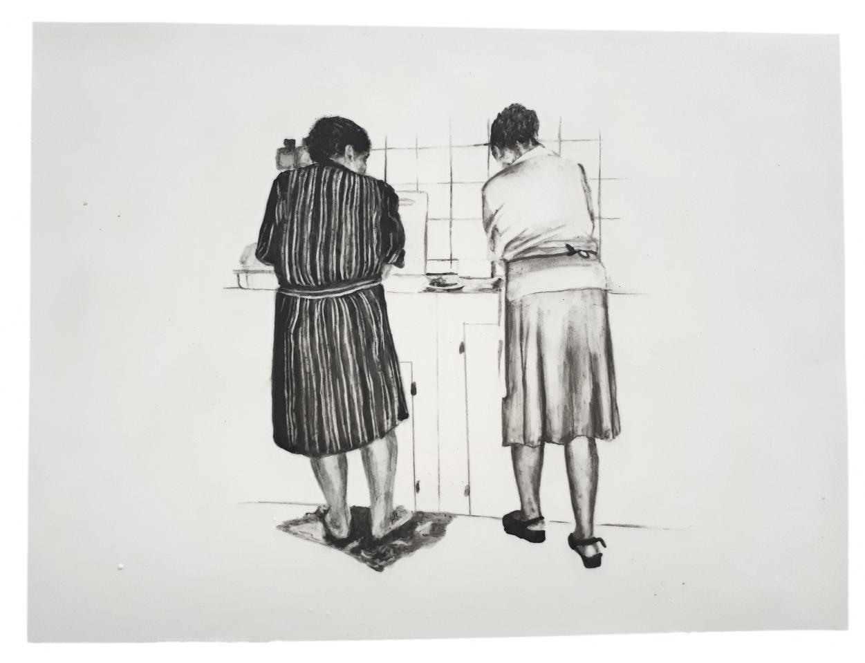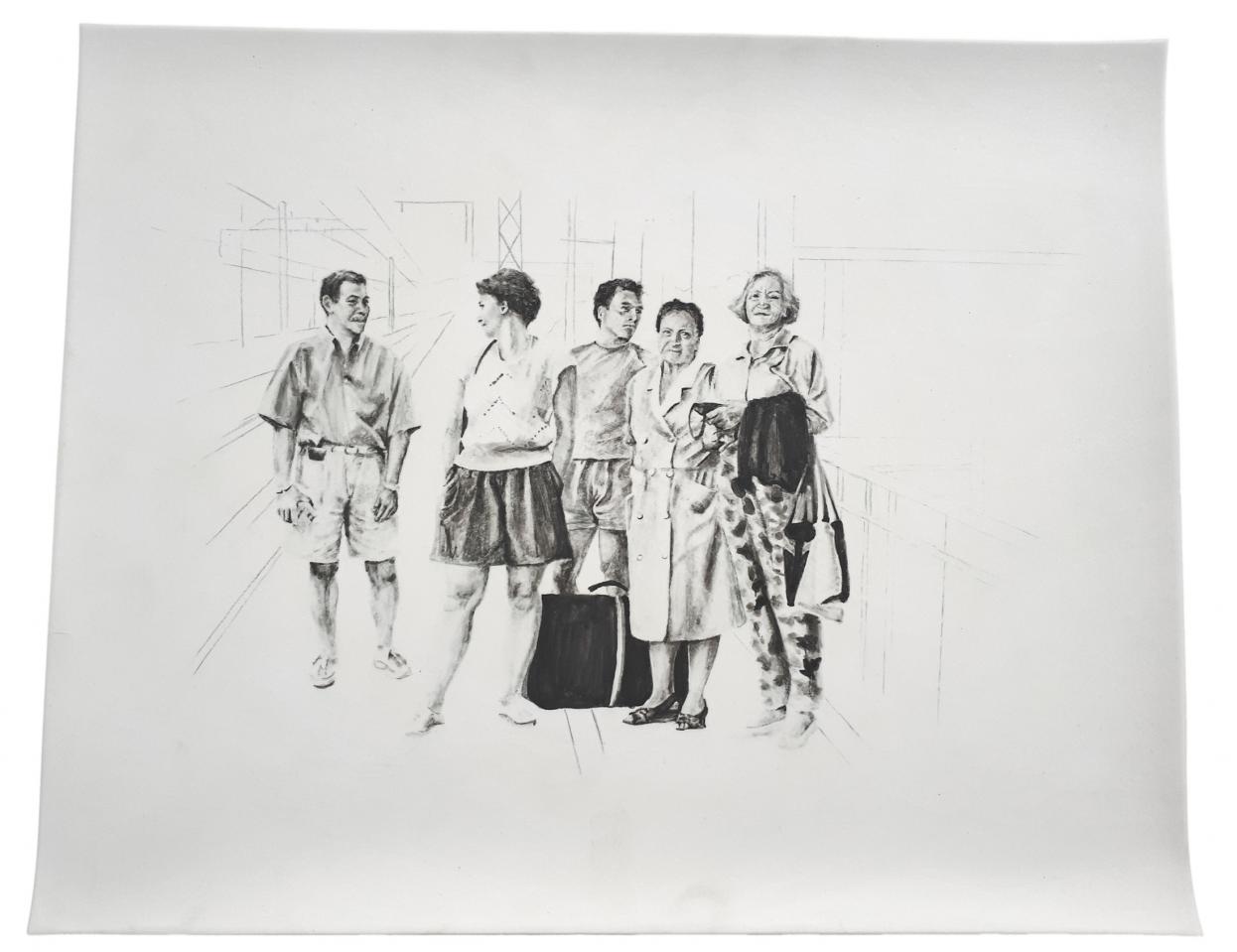 Les titres sont légers et innocents comme l’enfance : Repas de famille ou À la pêche, mais le ton oscille entre légèreté et gravité, car le dessin recrée des situations ambiguës à partir de ces photos-souvenirs, un moment heureux ou malheureux, des atmosphères familiales où la situation peut être tendue, le malaise d’une sensation parfois. Mais il faut éviter le pathos, pointer le jeu des regards, souligner cet homme aux yeux perdus dans le vague, la présence de l’alcool, une jeune mère enamourée, il faut retrouver dans chaque image l’histoire d’une famille et la mettre à distance, réinventer des scènes montrant la complexité des relations familiales, parler de la cruauté de l’enfance, des tensions aussi. Mais les corps semblent flotter et les rapports d’échelle paraissent parfois étranges en l’absence des décors ; restent les regards, les postures des corps mis en avant au détriment de la narration elle-même. On pense à la série de Massinissa Selmani : A-t-on besoin des ombres pour se souvenir ? L’artiste affirme : “Ce qui m’intéresse dans le dessin, c’est qu’il donne une certaine autonomie. (…) Il y a une dimension documentaire dans le dessin.”