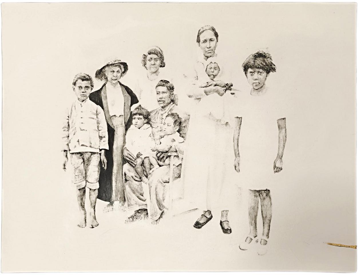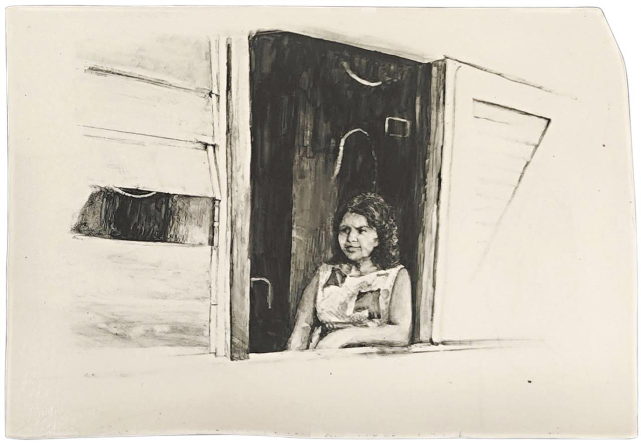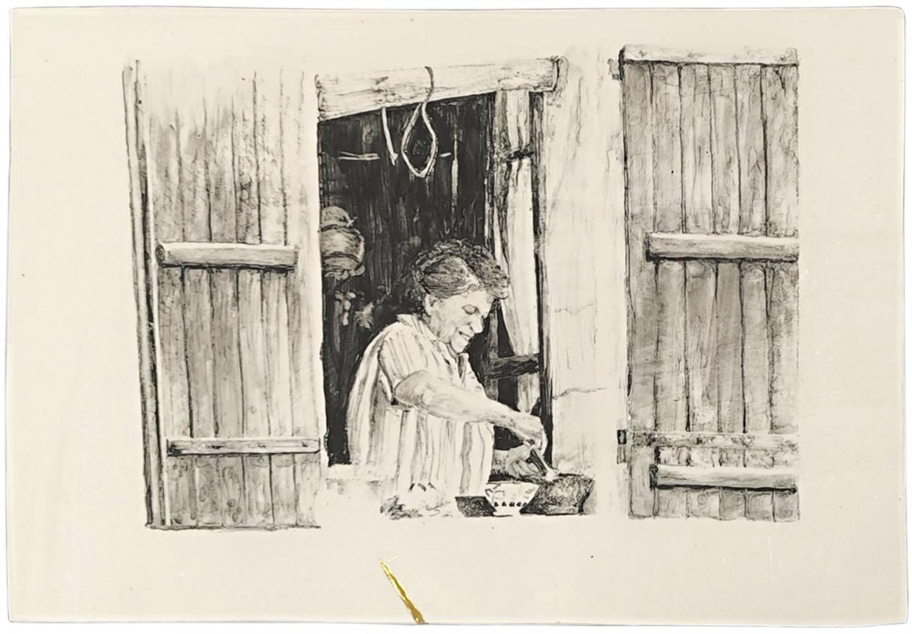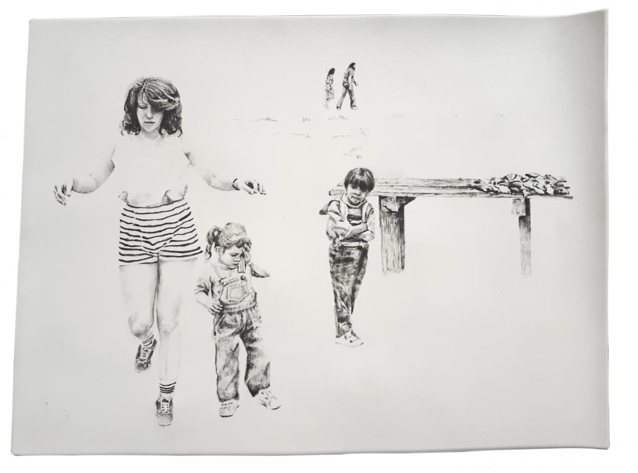 « Pourquoi abandonner le dessin à quelques nostalgiques qui en prônent un usage normatif et rêvent de retour au “beau métier” ? demande Conte1 et il poursuit : “Ne soyons pas frileux, prenons le dessin à bras-le-corps, sans complexe, et dessinons avec ce que bon nous chante.” C’est bien ce que propose Stéphanie Hoareau dans cette nouvelle série. En effet, après de très grands formats peints, des paysages ou des portraits d’inconnus, l’artiste se tourne vers le dessin sur de fines plaques de porcelaine, dans une série de scènes de genre mémorielles. Il était déjà question de mémoire, de racines, pour la grande forêt titrée Bélouve, ici elle tente de restituer des fragments de souvenirs en partant de photographies de famille associées à la perception qu’il lui reste de ces moments de son enfance.