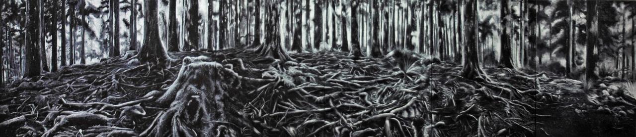 Nécessaire collaboration symbiotique du végétal et du minéral qui a pour finalité l’émergence de la vie. Expression d’un combat séculaire, l’harmonie résultante ouvre à la réflexion sur les valeurs au cœur de cet ensemble. Le désordre apparent qui règne dans cet amas de racines peut induire en erreur. L’illustration de ce combat séculaire de l’individu contre les éléments donne l’impression qu’il est perdu d’avance.