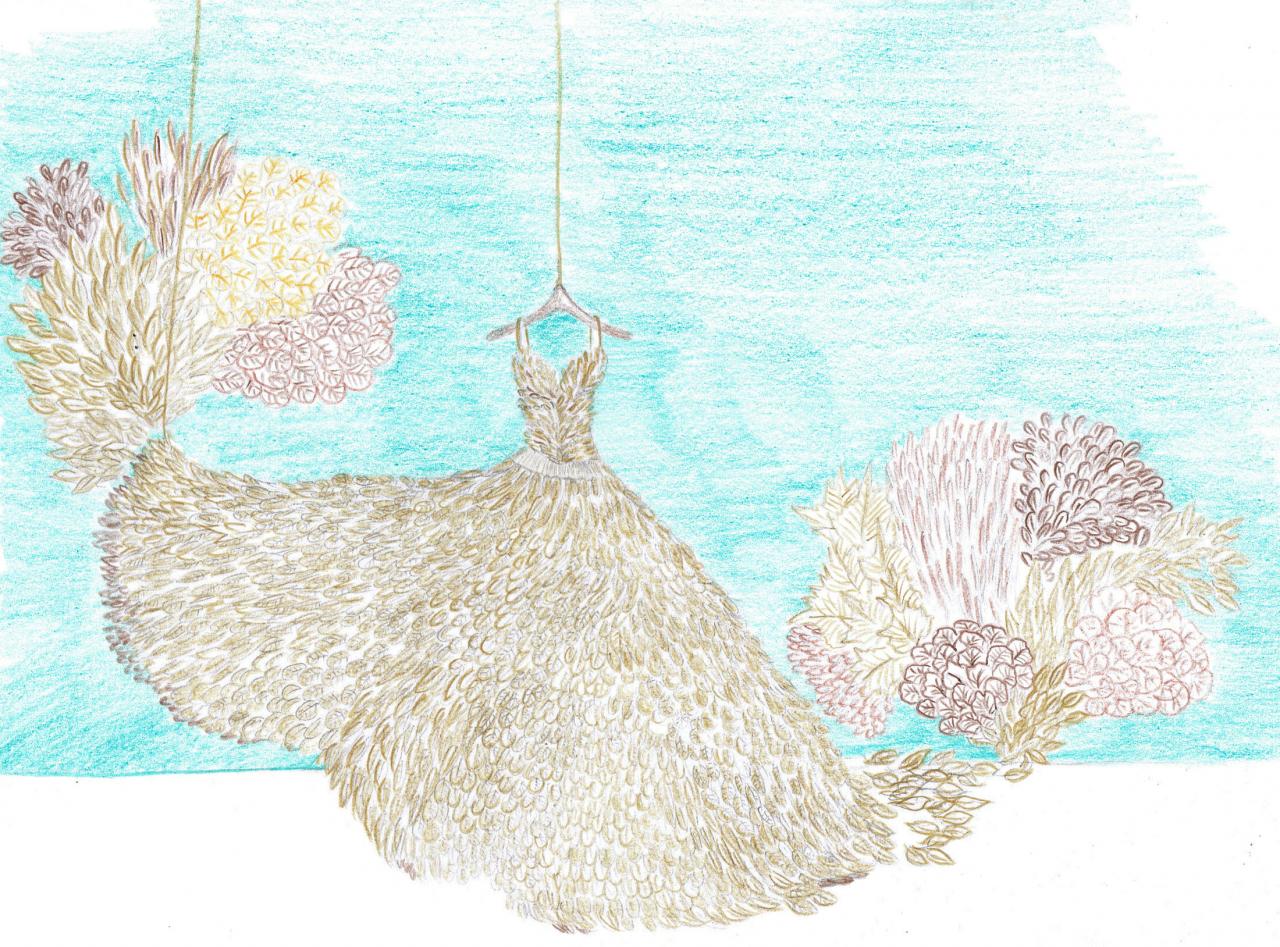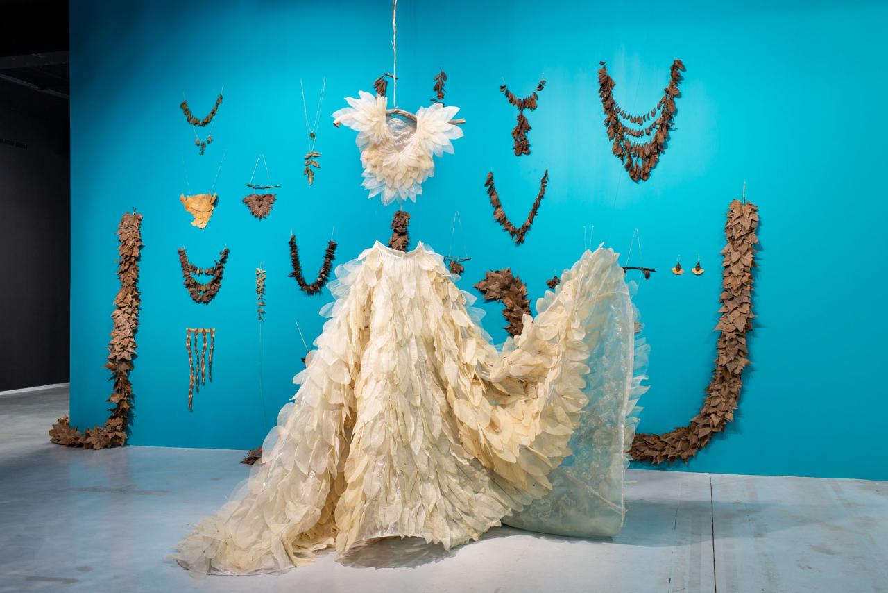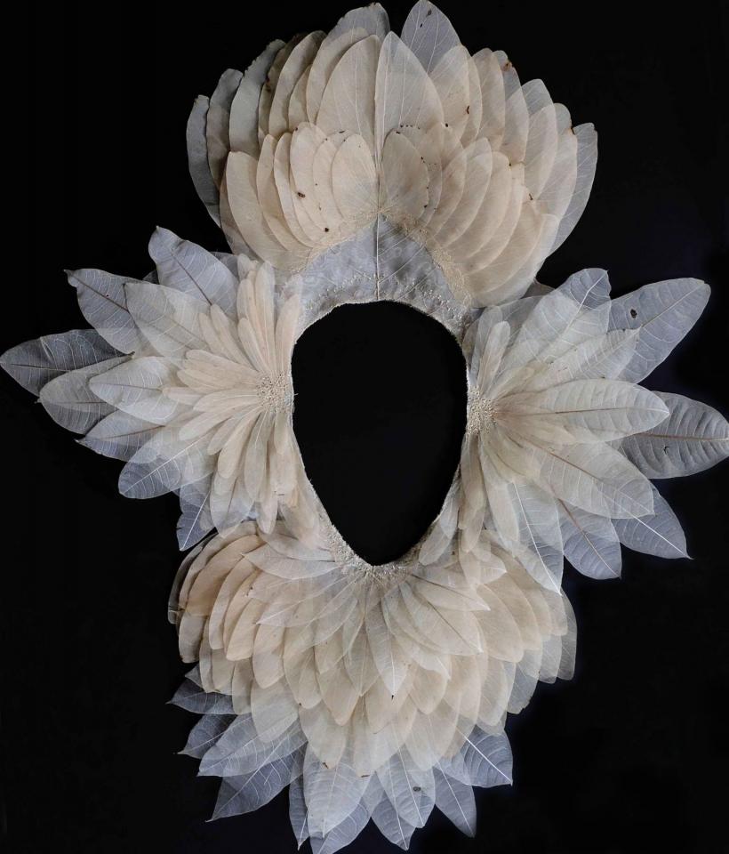 Elle présente dans la galerie noire, une robe végétale pensée à la mesure de son corps, qu’elle prolonge dans l’espace. De la récolte à la broderie, en passant par les étapes de couture et d’assemblage, l’artiste fabrique des entités vivantes exigeant patience et attention. Dans les galeries, elle présente des dessins-collages figurant les oiseaux présents à La Réunion. Les dessins sont augmentés de feuilles tombées que l’artiste a patiemment récoltées, fait sécher et teintées. Dans la répétition et la précision de chacun de ses gestes, Tatiana Patchama instille et revendique une dimension artisanale inhérente au fonctionnement même du vivant. »