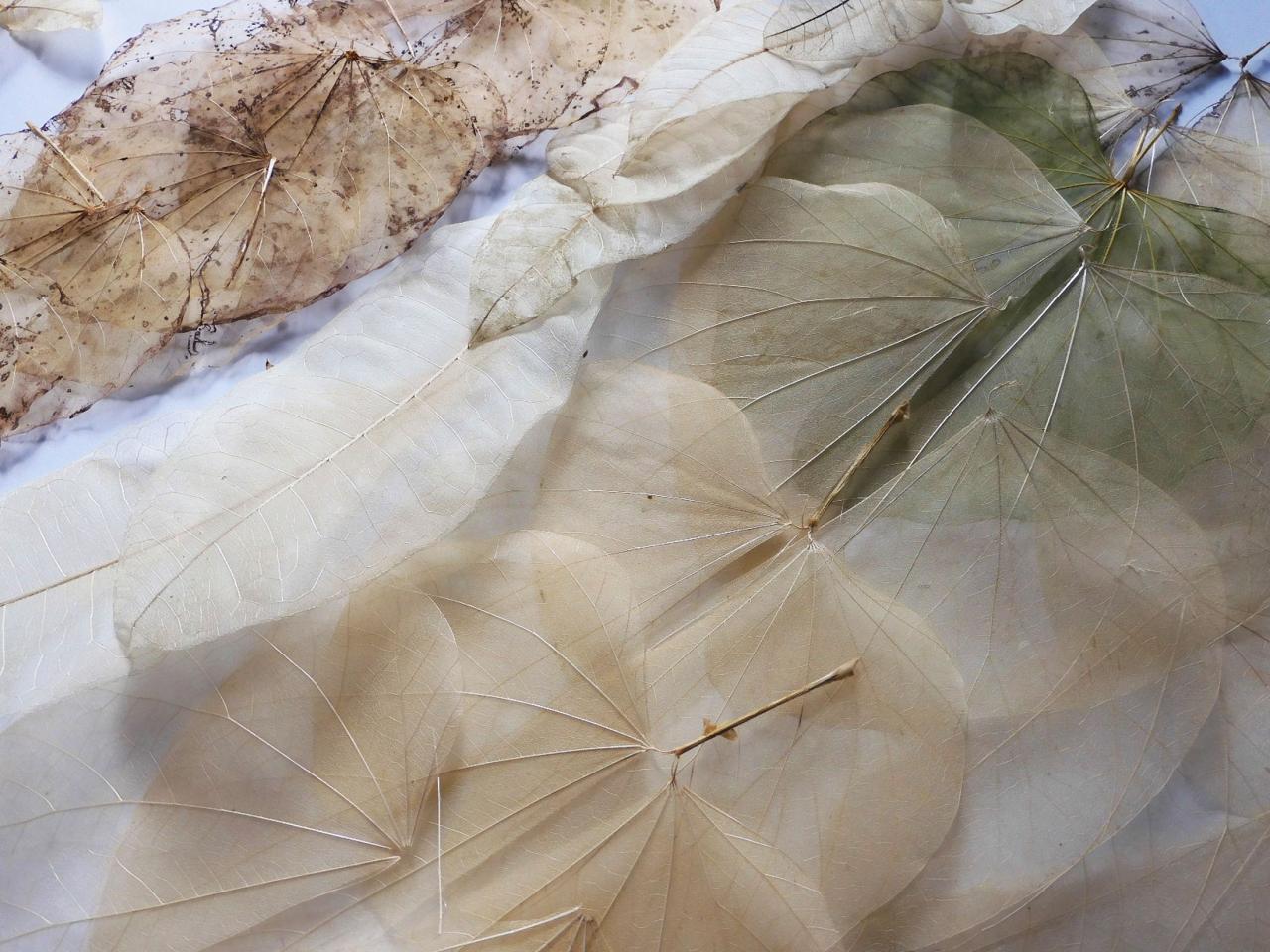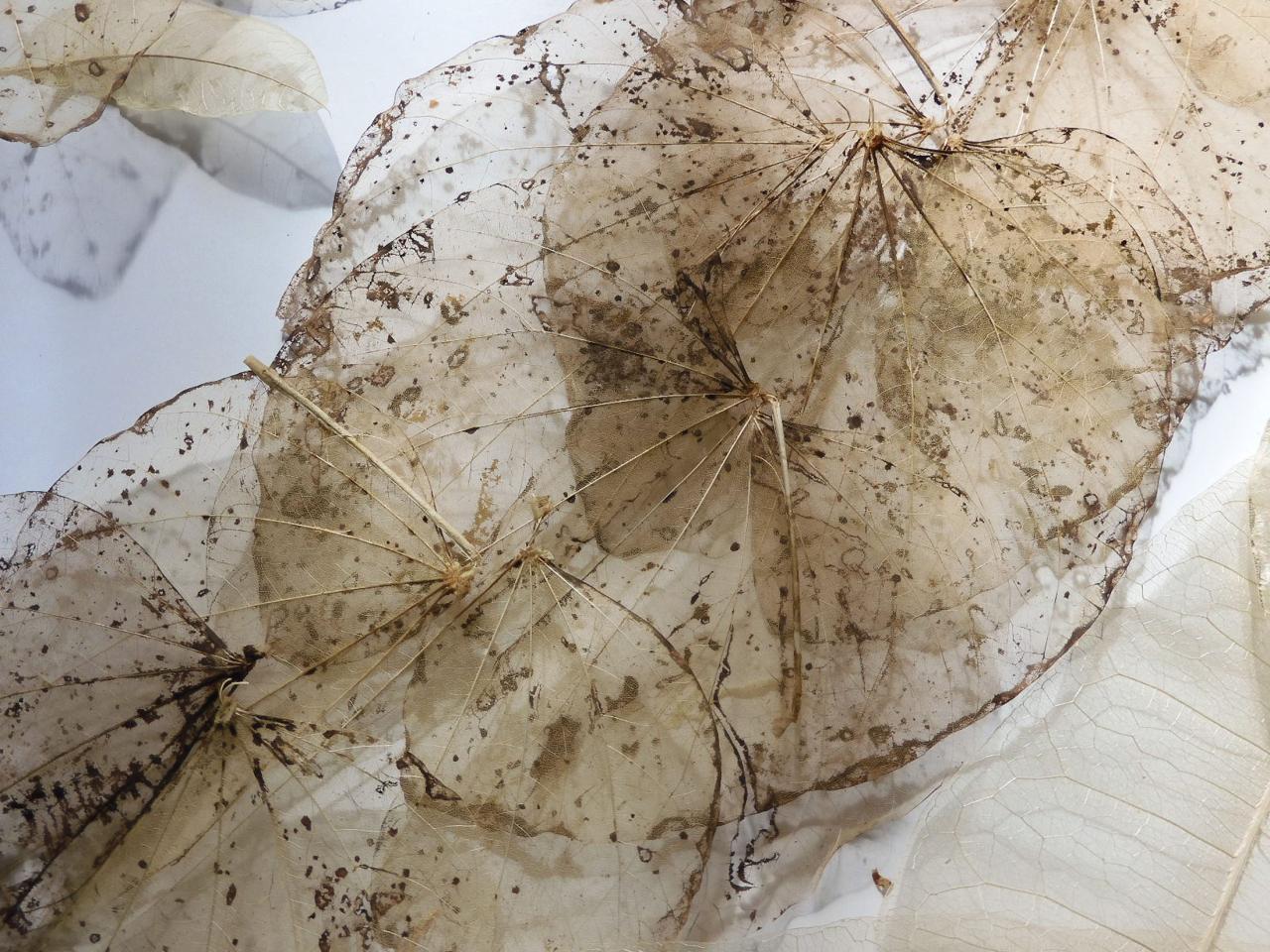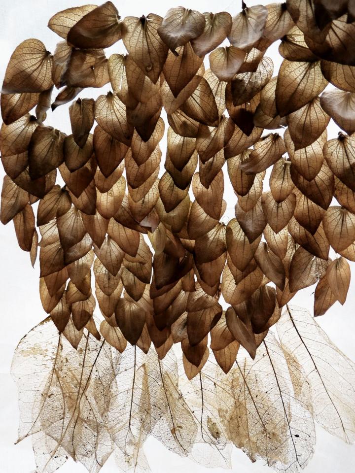Installation, squelettes de feuilles cousues au fil d’or sur textile (organza) et feuilles séchées assemblées au fil d’or, dimensions variables.