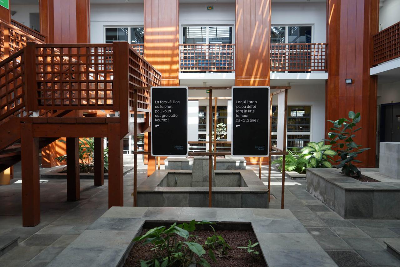 Depuis deux ans, Zièt dann Fénoir entreprend une marche à la rencontre du public, c’est la raison pour laquelle elle se déplace, change de support, d’échelle, s’invite dans de multiples lieux, parfois à quelques pas et parfois au-delà de l’océan. Cette exposition propose un dialogue entre l’intérieur et l’extérieur de chacun des lieux qui l’accueillent.