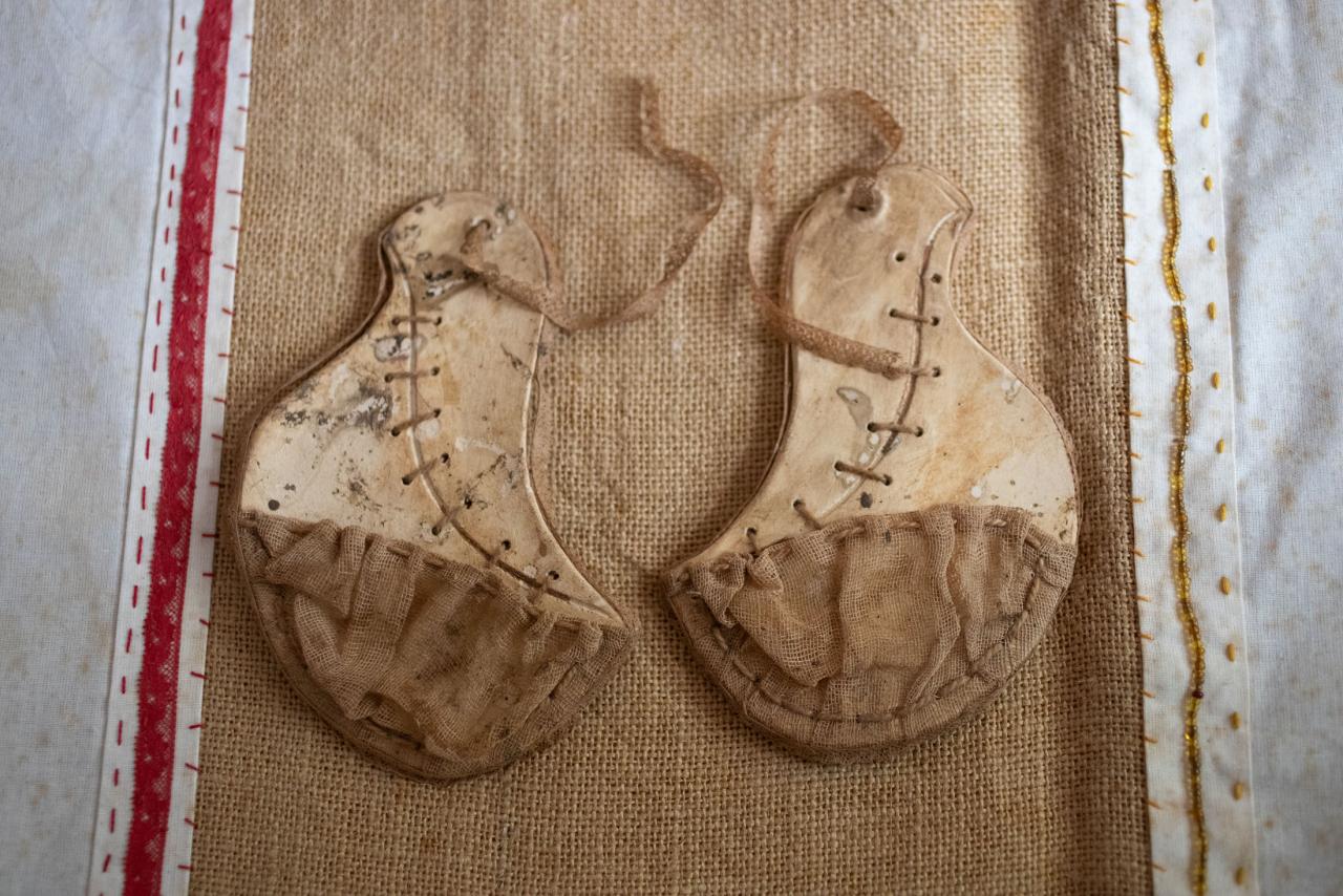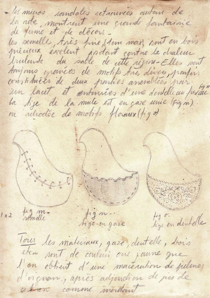 Les micro sandales retrouvées montrent une grande fantaisie de forme et de décors. Les semelles, toujours gravées de motifs très divers, sont parfois constituées de deux parties assemblées par un lacet et entourées d’une dentelle au fuseau. La tige de la mule est en gaze unie ou rebrodée de motifs floraux.