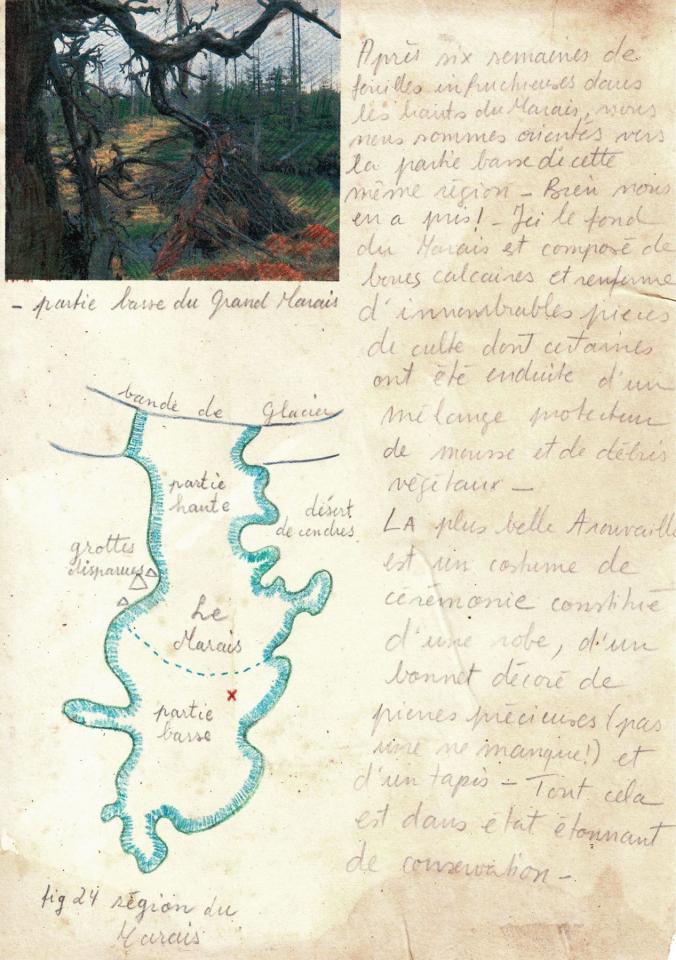 « Ce costume fait partie d’un ensemble d’innombrables pièces de culte découvertes dans les boues calcaires qui composent le fond du grand marais. Certaines de ces pièces ont été trouvées enduites d’un mélange protecteur de mousse et de débris végétaux, ce qui peut expliquer leur étonnant état de conservation actuel.