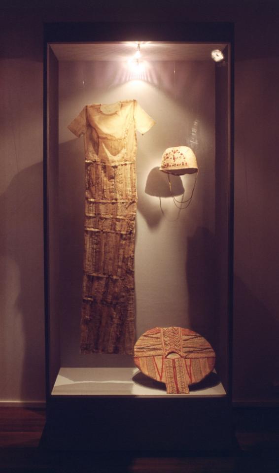 Ici se dessine clairement la fiction archéologique à l’œuvre dans le propos, et dans la forme même de l’installation qui adopte les règles de la présentation scientifique pour montrer les objets exhumés d’un temps indéfini, suggérant seulement un très lointain futur, un stade inconnu de l’évolution humaine au cours de laquelle nos pieds seraient devenus minuscules et notre taille immense, nous-mêmes après des millénaires de mutation. Et en tension avec cet éloignement, là encore, la proximité, la familiarité des objets et de leur fonction : sandales, parures, costume nuptial ou robe de mater nité. Familiarité des couleurs aussi : le safran, les teintures naturelles dont la recherche occupe l’artiste depuis des années, la terre toujours qui imprègne le tissu de cette lourde robe de grand voyage à la solennité funéraire, le matériau utilisé, ici le lamba-mena, nous le suggérant discrètement. Le vestiaire nous étonne par la richesse décorative, les formes étranges et les matières délicatement ouvragées, et pourtant il nous rappelle la garde-robe domestique, les coquetteries quotidiennes d’aujourd’hui, et le rapport au temps apparaît ici volontairement ludique. Si l’un se veut un peu devineur, l’autre se fait conteuse. Mais l’un et l’autre jouent de la fragilité de la matière, de sa transformation lente, de sa dégradation, des mutations étranges qui adviennent, toutes choses qui sont précisément le travail du temps, et dans l’aller-retour entre un temps si éloigné de nous, enfoui, où passé et futur se mêlent, et notre temps présent, l’un et l’autre se postent comme les passeurs malicieux, attentifs et patients.