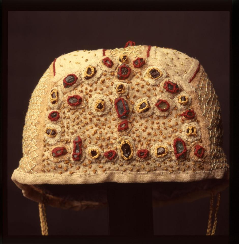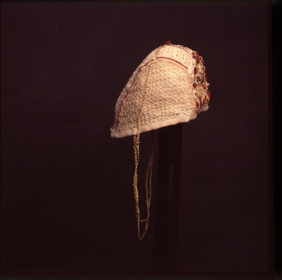 Le bonnet abondamment décoré, est teint au thé. La partie frontale en demi-cercle, est garnie de pierres précieuses rouge et vertes. Les deux parties latérales sont entièrement recouvertes d’une grille de fils couchés fixés aux intersections par des petits points. La partie supérieure est brodée de fils d’or. Une pierre maintient la tresse au sommet de la tête.