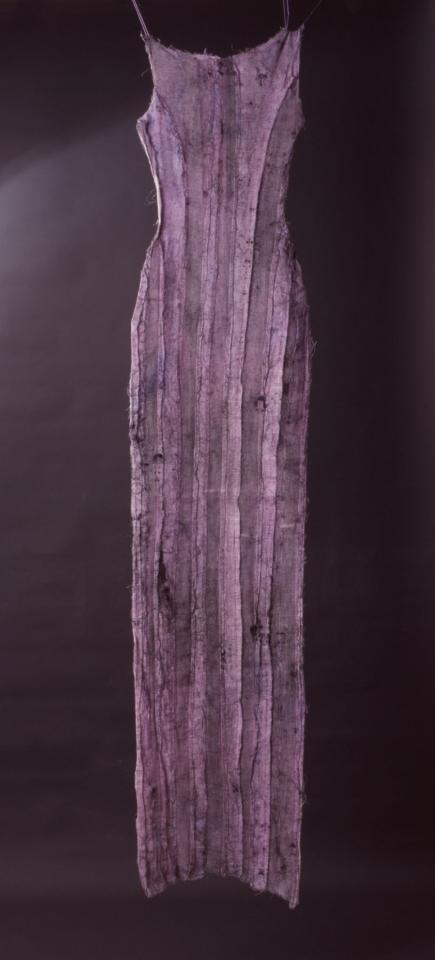 La robe est un assemblage de vingt longues bandes quasi transparentes, ajustées aux formes du corps pour en affirmer la maigreur chic. L’étoffe légère et transparente a certainement été tissée de fils d’épeire diadème (arachnide). La couleur, initialement rose, est devenue violette au cours de son long séjour sous la cendre.