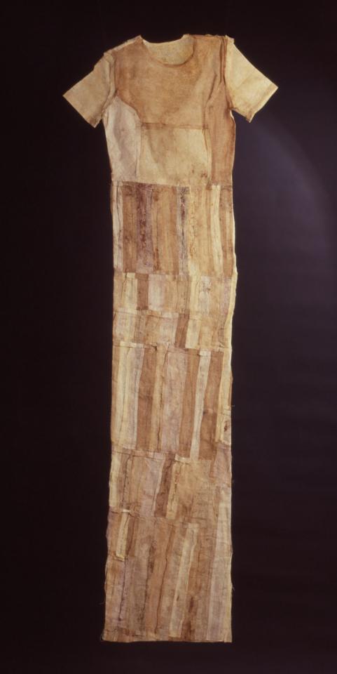 Robe en bandes de tarlatane assemblées, teinte dans les pigments et la cendre de bois.