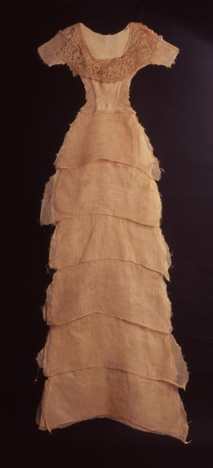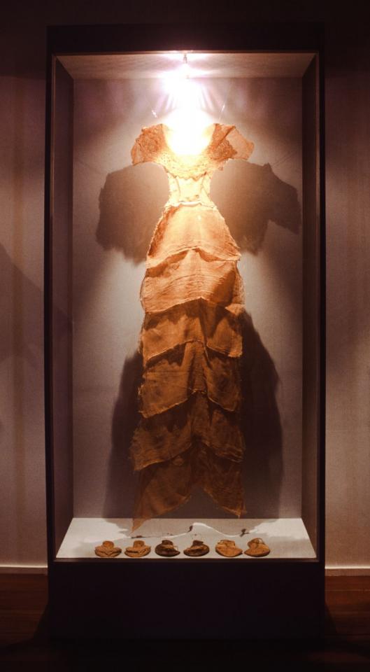 Robe à six étages, tarlatane, coton et dentelles teints dans la pelure d’oignon, sandales avec semelles en terre, dessus en dentelle ancienne, vitrine.