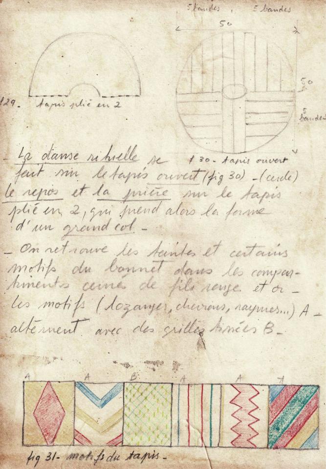 Le tapis de prière sur lequel s’effectuait la danse rituelle est en forme de grand col double. On y retrouve les teintes et certains motifs du bonnet dans des compartiments cernés de fils rouges et or ; des demi-losanges remplis de petites croix alternent avec des motifs de grilles tissés. Les fils d’or marqueraient non seulement la richesse du propriétaire mais aussi sa vertu.