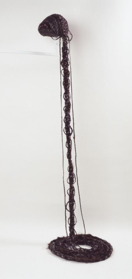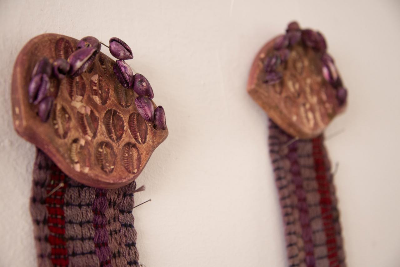 Fil de cuivre, terre cuite, bois sculpté, coquille d’oeuf d’autruche, épingles à chapeaux anciennes, sur goni (toile de jute).