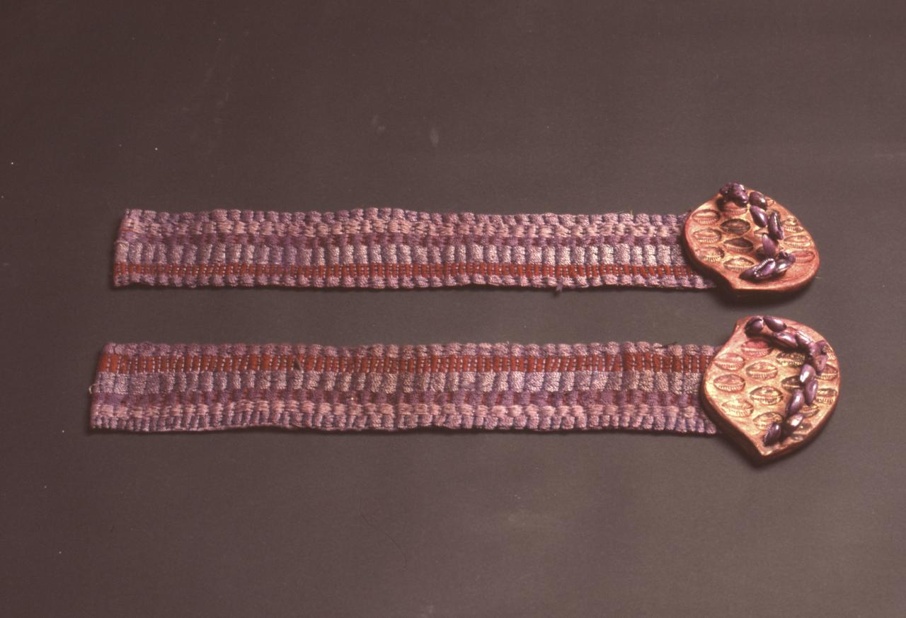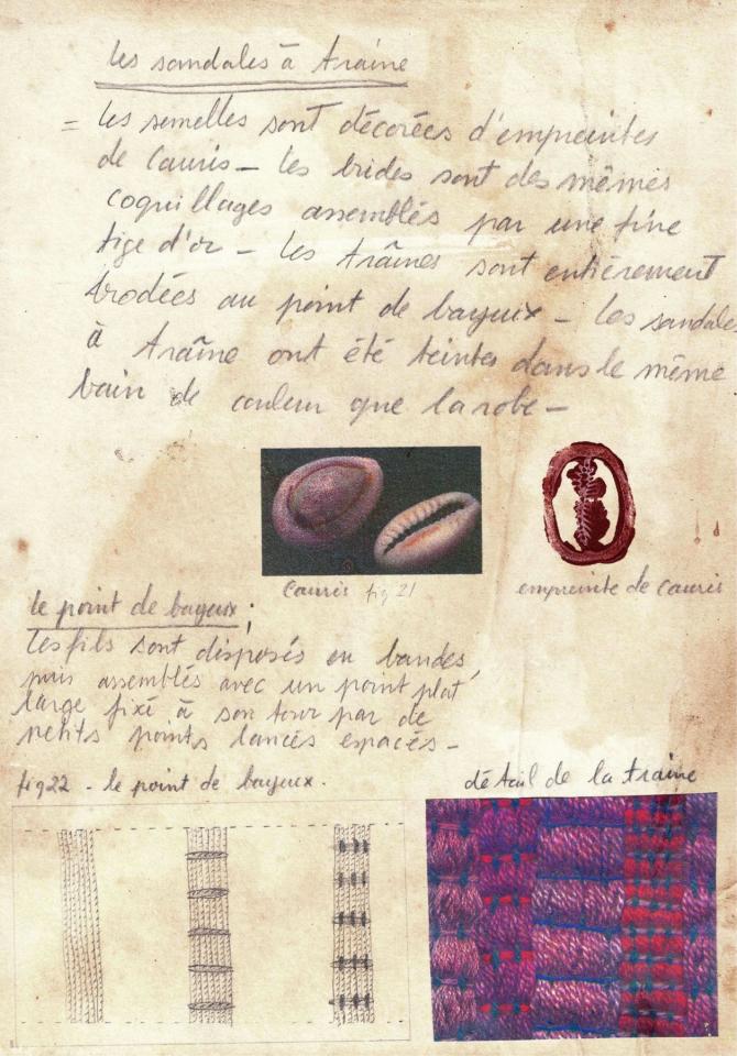 La matière des semelles, décorées d’empreintes des mêmes coquillages, est de nature inconnue. Les brides sont de cauris assemblés par une fine tige de métal. Les traînes sont entièrement brodées d’un motif à rayures au point de Bayeux.