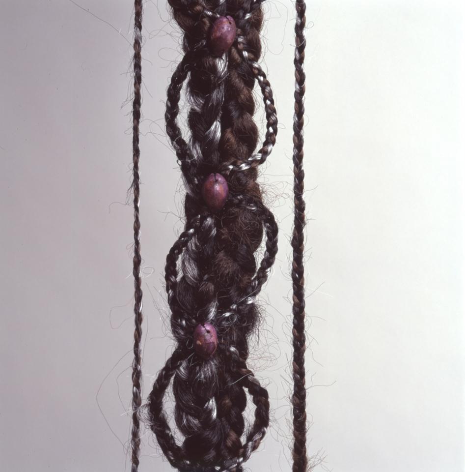 Coiffe de 6 m de long en cheveux tressés et cauris.