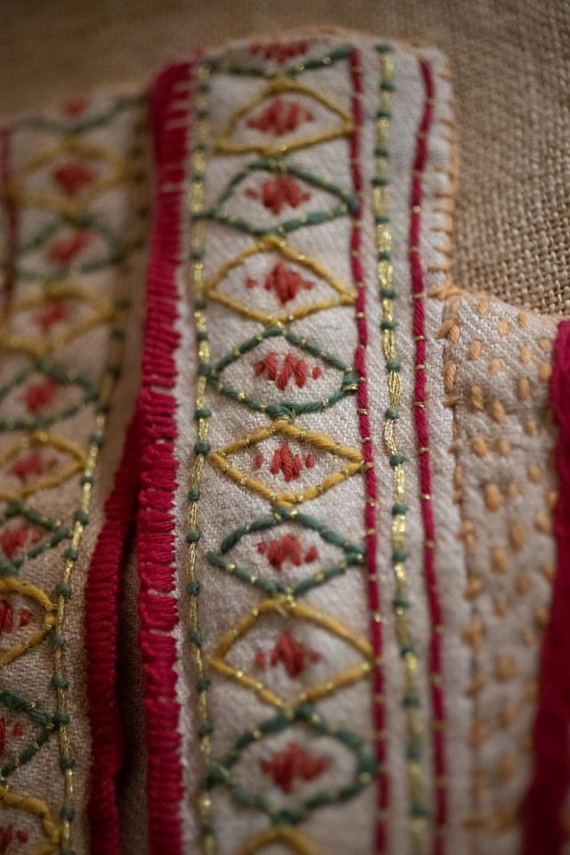 La jupe, confectionnée de 140 fines bandes, est fixée au corsage ample à manches courtes. Les pièces ont été soigneusement assemblées afin d’obtenir un équilibre harmonieux entre les couleurs et les odeurs.
