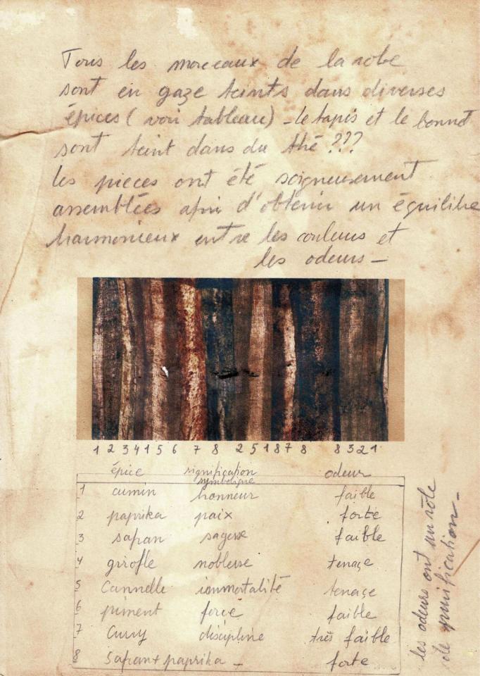 La robe à fermeture invisible, est composée de morceaux de gaze teints dans diverses épices.