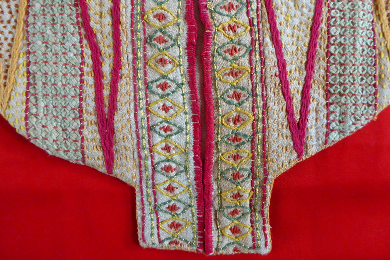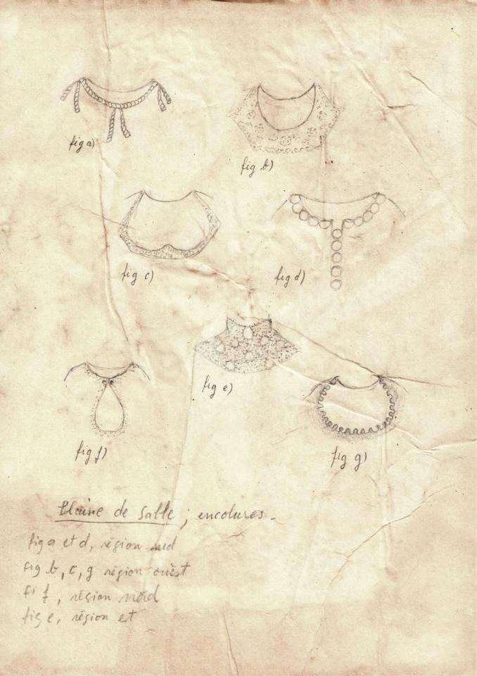 On a recensé sept sortes d’encolures, répertoriées selon l’origine géographique du vêtement. De plus, les motifs du col diffèrent selon que la femme est célibataire ou mariée.