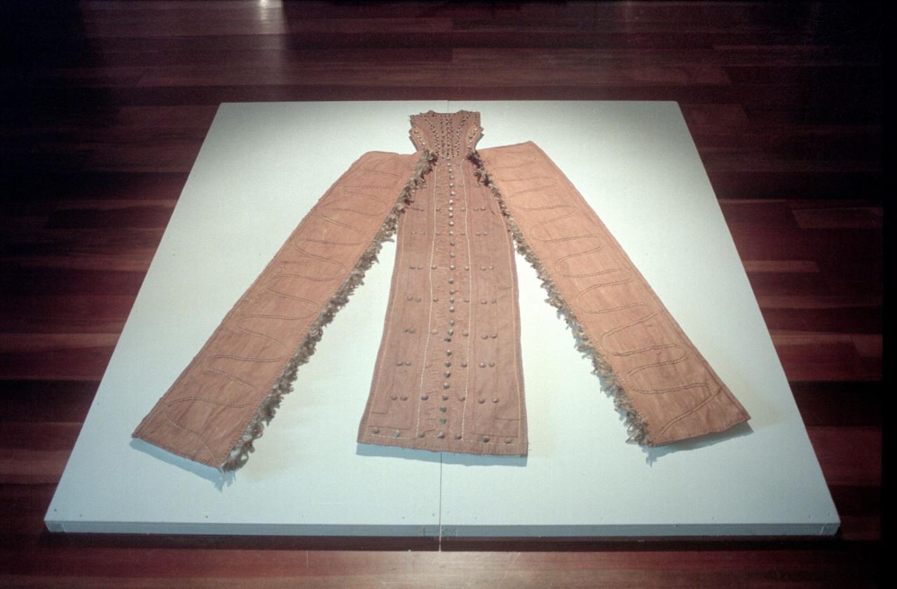 « Le costume a été découvert dans la région la plus austère et aride, le Désert des Cendres. Il est constitué d’une robe fourreau, disposée entre une coiffe et une paire de sandales à traîne, le tout reposant sur une plateforme de pierres et recouvert d’une couche de cendres.