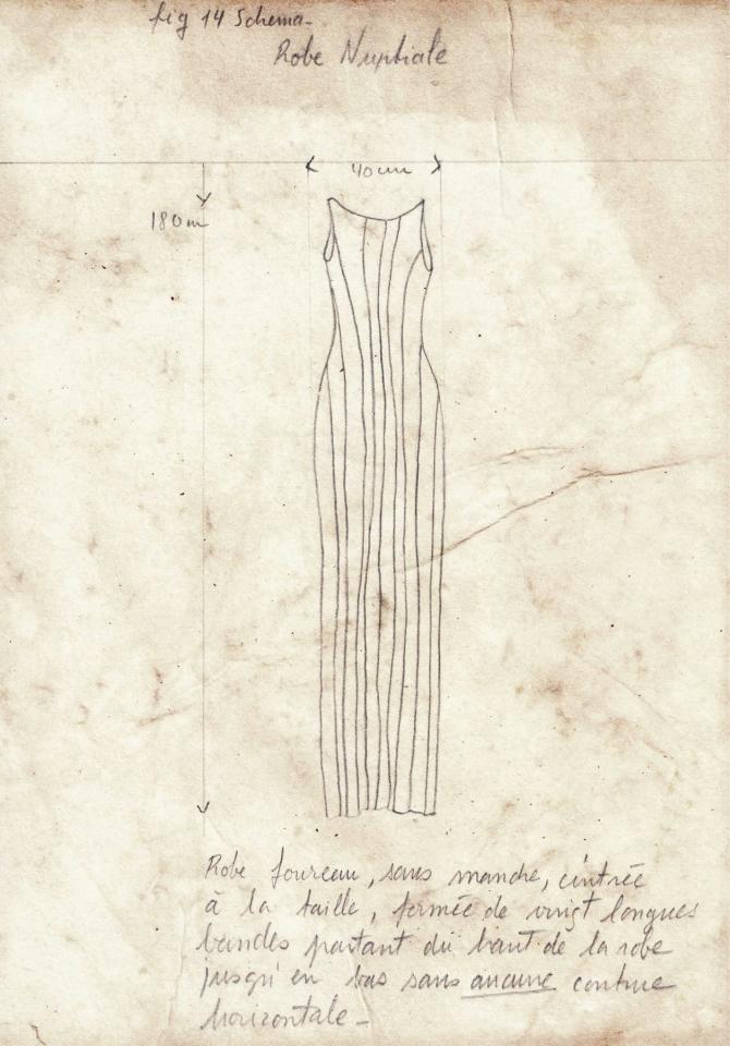 L’étroitesse de la robe d’étoffe fragile, le poids de la coiffe ainsi que la rigidité des sandales et la longueur de leur traîne ont été conçus pour assurer une parfaite immobilité à la jeune fiancée. »