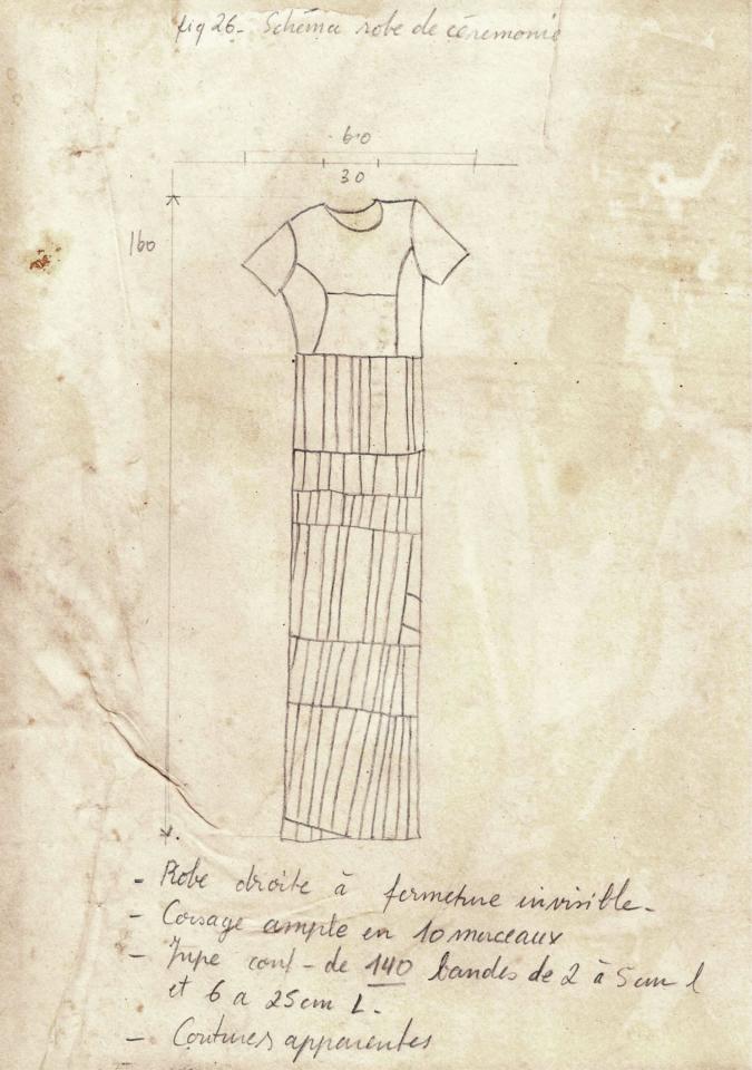« Ce costume a été trouvé couché sous des galets ronds disposés en spirale au fond de la grotte de la plaine de sable. Il est constitué d’une robe souple et de trois paires de micro sandales. La robe est composée d’un corselet très ajusté à manches courtes, garni d’un col plat en dentelle à l’aiguille, fixé sur un grand décolleté, et d’une jupe de six volants plats s’évasant par le bas.