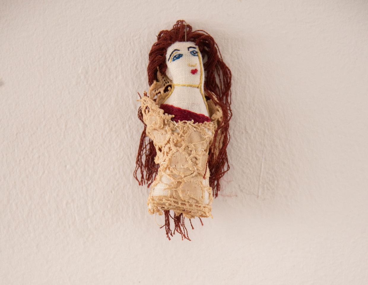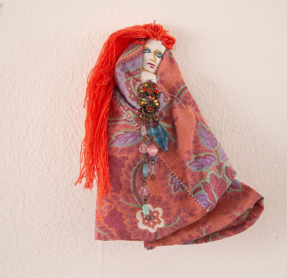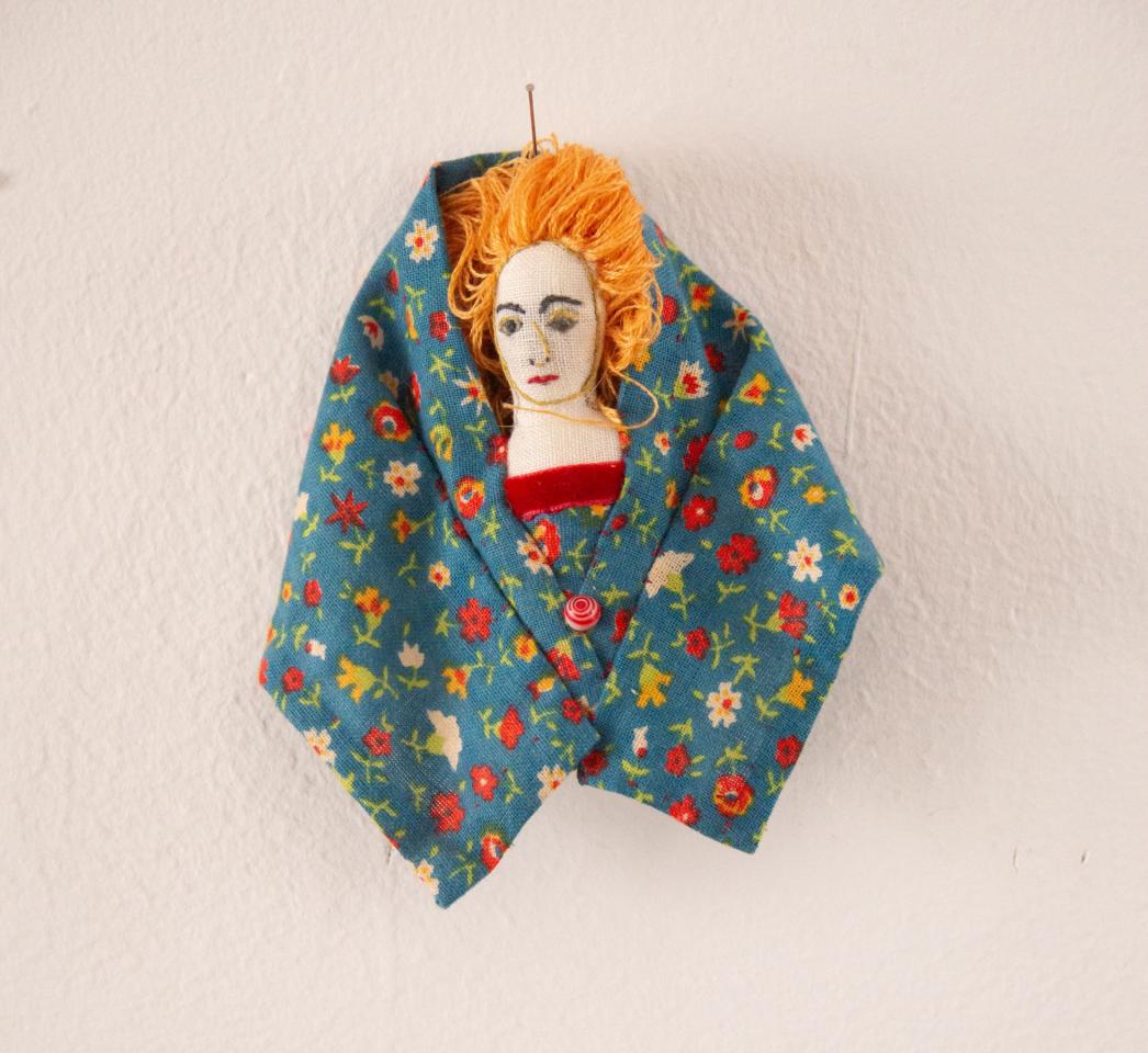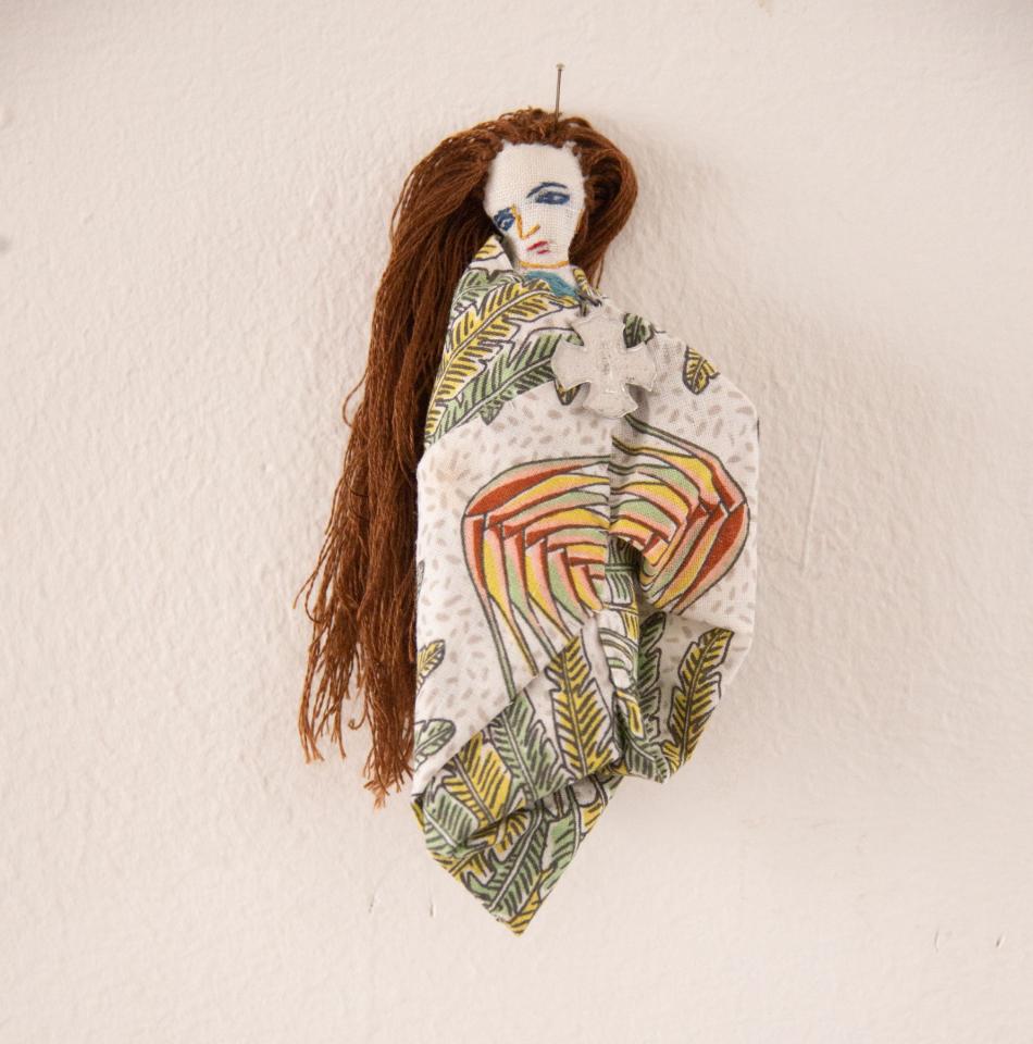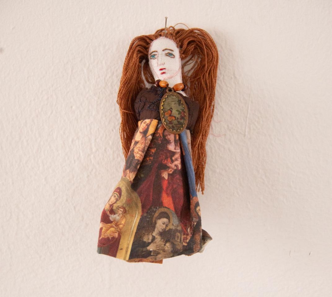 Bustes cousus et rebrodés, fil à broder, tissu, perles, pièces de bijoux et de chapelets, médailles, 10 à 18 cm.