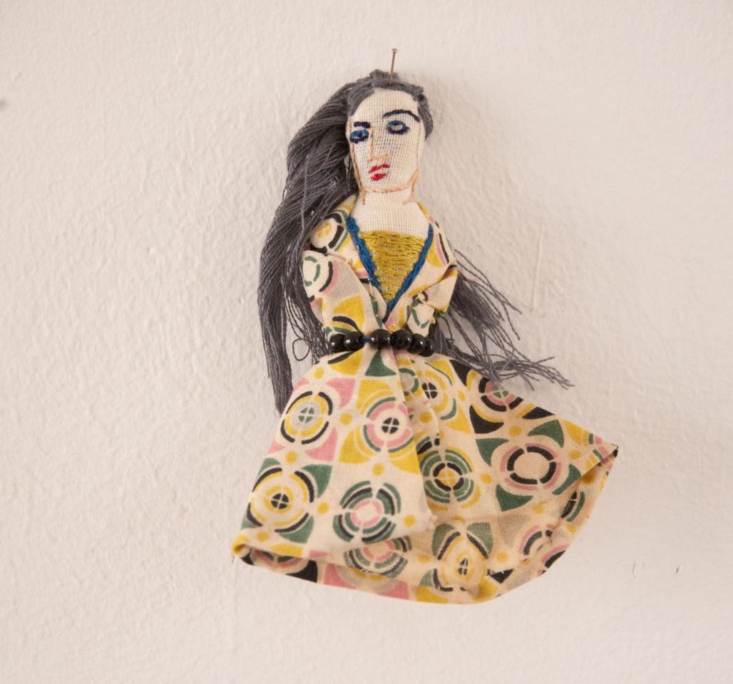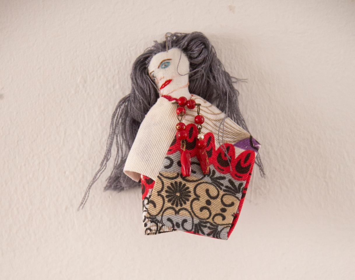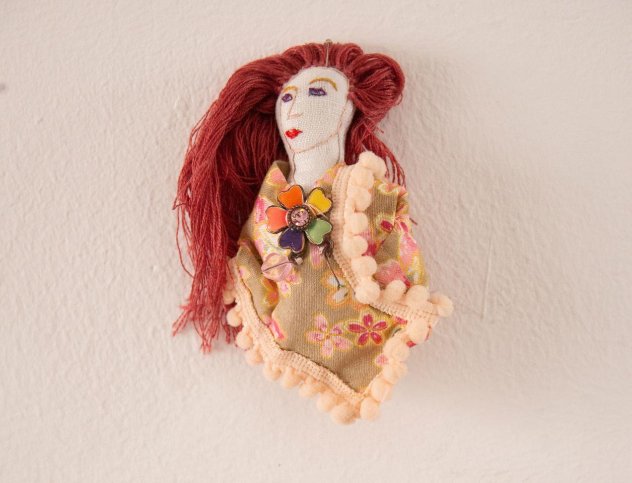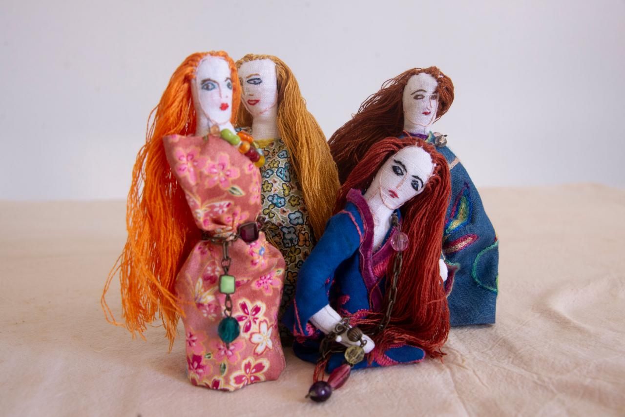 Bustes cousus et rebrodés, fil à broder, tissu, perles, pièces de bijoux et de chapelets, médailles, 10 à 18 cm.