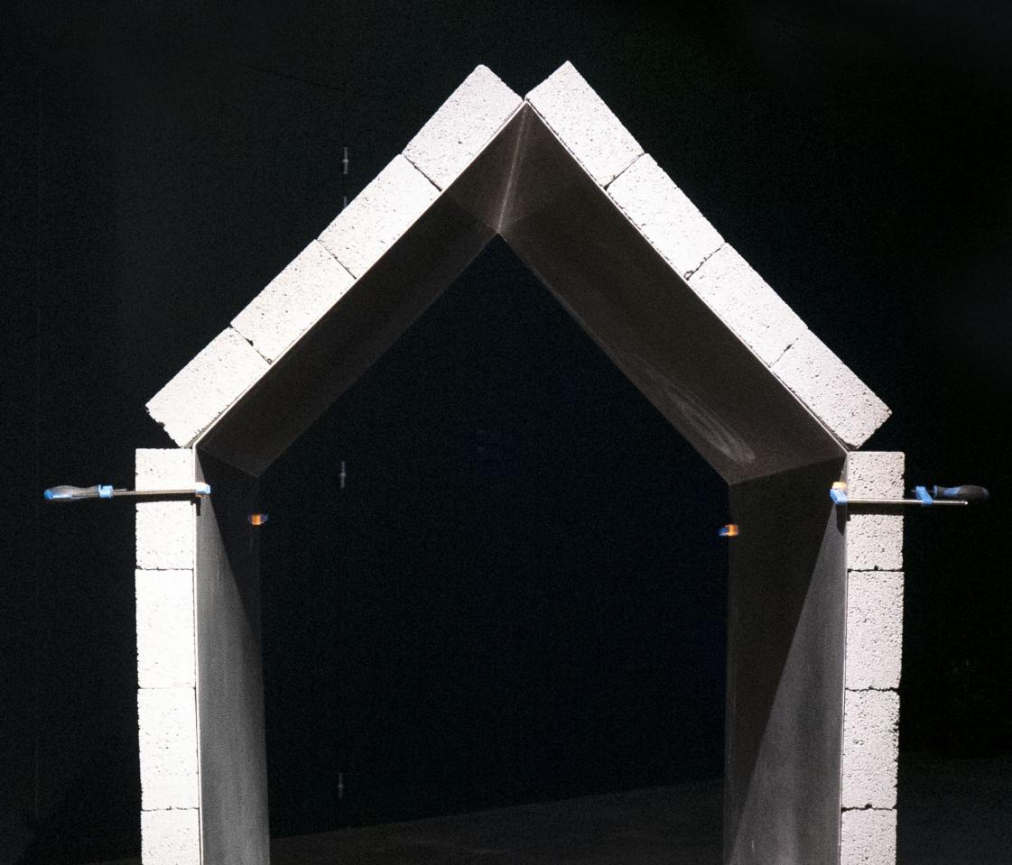 Sculpture, parpaings, inox, serre-joints, palette, 120 x 110 x 160 cm.