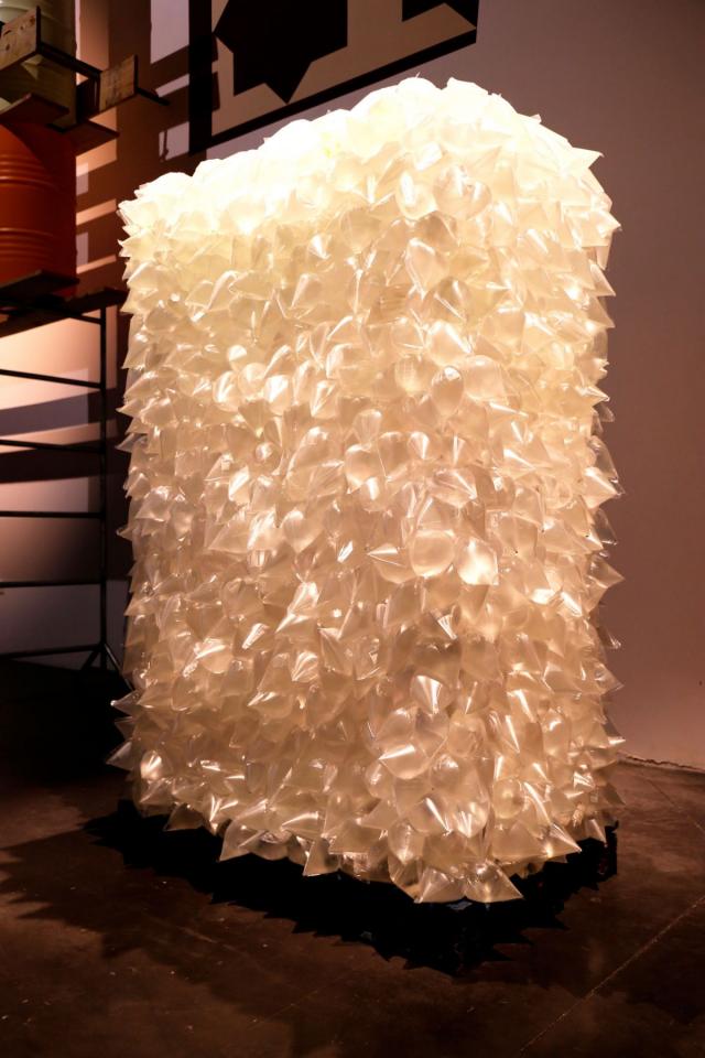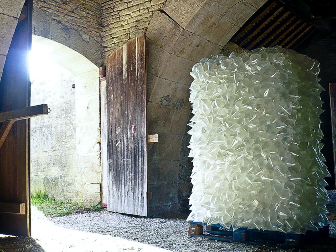 Installation, palette, sacs plastique, eau
