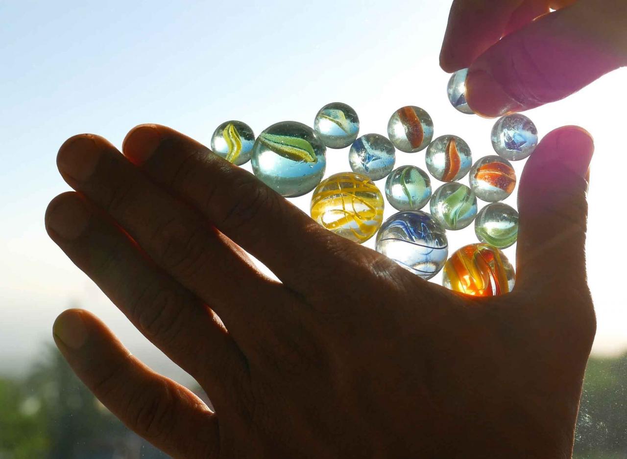 Après plusieurs projets sculpturaux complexes, Tiéri Rivière décide en 2020, comme Philippe Delerm avant lui, de se consacrer aux petits gestes domestiques. Peut-être était-ce dû à l’enfermement que nous vivions tous, peut-être tout simplement un pied-de-nez aux parpaings qu’il affectionne tant… Quoiqu’il en soit, sa vidéo, présentée au musée Léon Dierx dans le cadre de l’exposition Derrière la lumière, la mémoire retrouvée, est en effet d’une simplicité saisissante. Face aux grands volumes qu’il déploie par ailleurs, elle met en jeu ces petits objets cylindriques, souvenirs d’une enfance sans souci : des billes. On voit Rivière les prendre en main et s’appuyer contre une vitre, tentant de les maintenir toutes en équilibre. Cet assemblage semi-foutraque et drolatique emplit pourtant de nostalgie. On repense aux cours de récré, aux jeux sans buts et sans contraintes, a contrario des règles strictes qui régissent toujours le monde de l’art contemporain. C’est aussi un regard décalé sur le paysage de la Réunion, depuis l’intérieur du foyer, métamorphosé par le verre semi opaque de ces billes colorées. Comme si Delerm portait son regard à travers le houblon liquide contenu dans son verre…