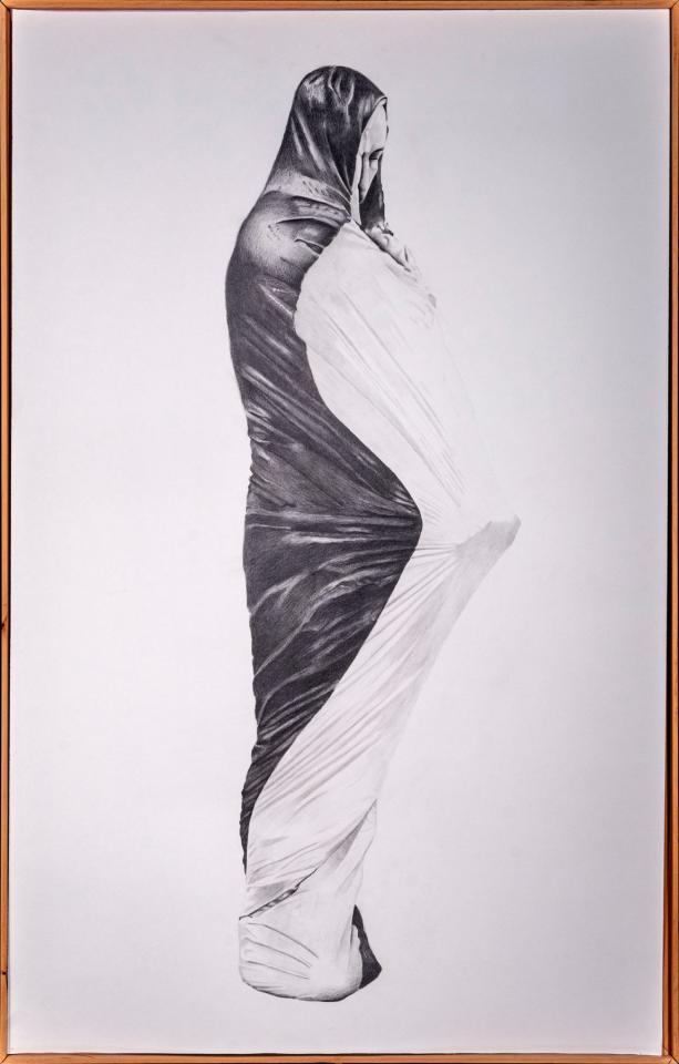 Son quotidien apparait entre les lignes, notamment dans la série des contorsions, qui le dépeint empêtré dans un sac de couchage. Il y est si bien emmitouflé qu’il semble disparaitre dans son cocon. Dans un autre dessin, tout aussi surprenant, son pied droit livre bataille au gauche, dans une prise de karaté contre lui-même. Je repense avec humour à l’acte IV d’Ubu Roi, la pièce d’Alfred Jarry. Le Père Ubu, incarnation de la malveillance, frôlant toujours l’absurde, se trouve alors en Ukraine, où il livre une bataille aussi burlesque qu’épique. La scène se clôt évidemment sur un Ubu battu ; battu à plates coutures. Comme l’Ubu de Jarry, ou des gravures de Georges Rouault exposées tout près des travaux de Rivière, le personnage s’efforce, se contorsionne, mais toujours vainement. Aspiré par le démon du sac de couchage, il en disparait presque, englouti par le blanc tournant de la page. L’artiste papillon est redevenu chenille…