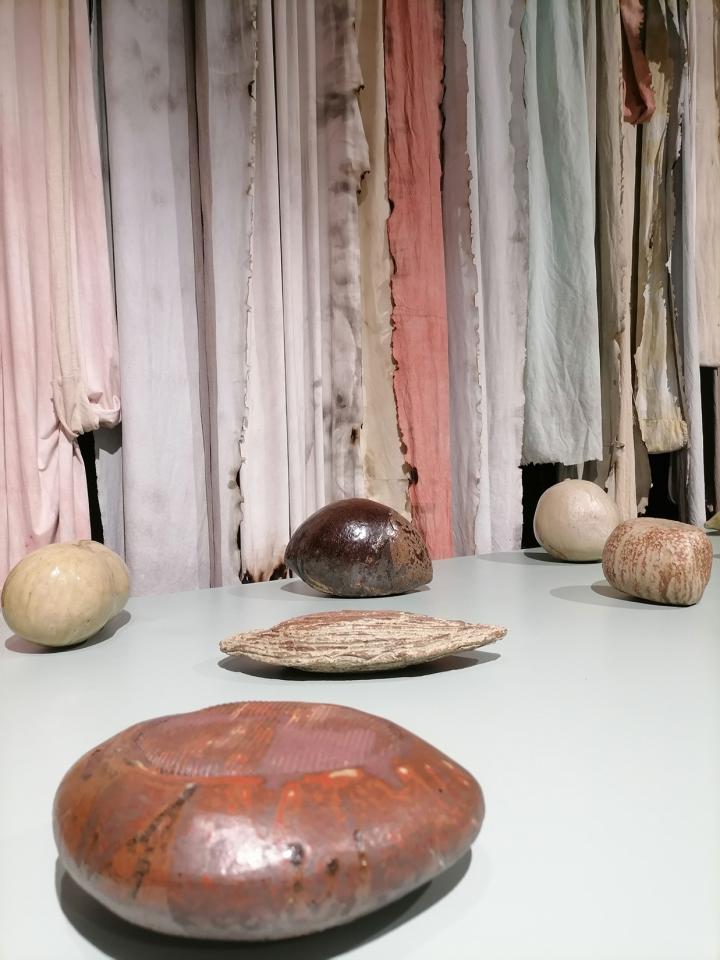 Cette pièce en cours de création résonne avec Le Cordon des graines réalisée quelques années auparavant. Cette installation évoque le mythe romain des trois Parques, divinités maîtresses de la destinée humaine, de la naissance et de la mort. Une quinzaine de graines réalisées en grès de Saint-Amand desquelles a surgi un émail blanc, allusion aussi bien au liquide séminal qu’au lait maternel, se déploie sur des machines traditionnelles en bois servant au tissage du lin. Tel un fil d’Ariane, le parcours offre une métaphore des cheminements possibles d’une vie, entre production humaine et élément naturel, entre conduite à tenir et aléas.