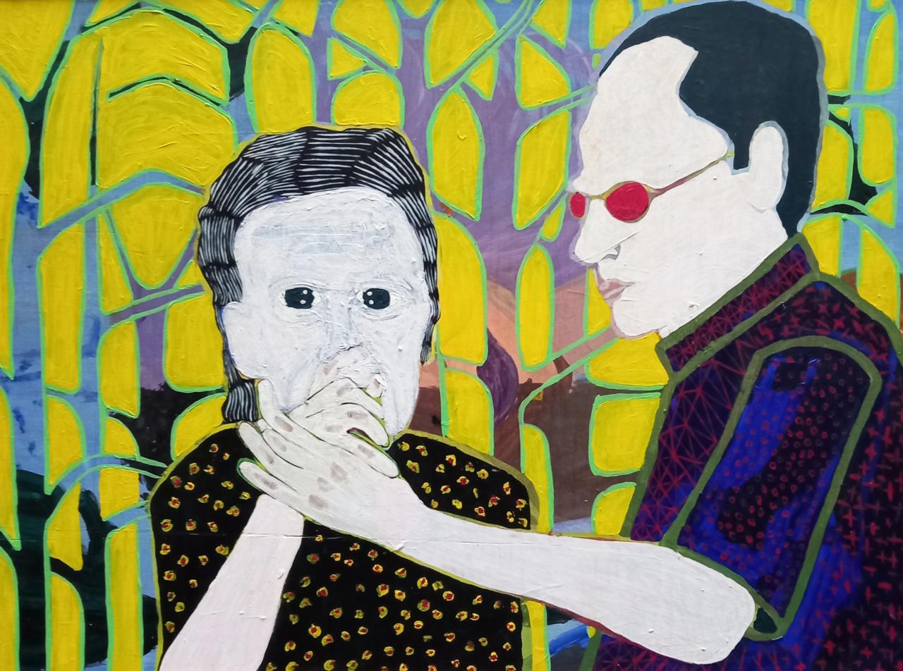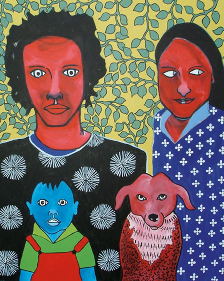 Stéphane Kenkle est essentiellement connu pour ses peintures. Il a été mu tôt par ce sentiment à la fois simple et viscéral pour un peintre : avoir le besoin et l’impression de pouvoir maîtriser chaque espace, chaque recoin de la toile et de tirer le meilleur d’une image. Son style est direct, sans fard, presque schématique. Les couleurs éclatent, souvent tranchées, sa palette originale n’oblige pas à un quelconque réalisme, bien que les œuvres de Kenkle soient figuratives. Ses premières peintures des années 2000, comme Gramoune (2005), sont telles des statements et des fils conducteurs d’une pratique qui, si elle a profondément évolué, garde des racines profondes et authentiques. Le peintre s’engage alors dans un chemin auquel il ne dérogera pas : il s’attachera à représenter les humains. Le portrait devient son genre privilégié et presque exclusif, comme il l’est pour Elizabeth Peyton. Tout autant qu’elle, il travaille d’après des photographies – anciennes ou qu’il réalise lui-même ; pourtant, si cette dernière s’attache à représenter une starification fantasmée, un monde de l’impossible et de l’exceptionnel, Kenkle, lui, choisit une voie à l’opposé. Il choisit de peindre les personnes qu’il côtoie ou qu’il a pu rencontrer, de parler d’intime tout en gardant une pudeur à la fois bienveillante et sincère. Sa conception de la peinture et son style d’il y a vingt ans maintenant s’approchent davantage de ce que produit l’artiste Marlene Dumas, connue pour ses portraits où la sphère du privé rejoint de grandes questions de société, tandis que le sensible s’avère omniprésent et essentiel. Comme si c’était une évidence, Kenkle s’intéresse rapidement à montrer spécifiquement ses proches et sa famille. Il décide d’ancrer son œuvre dans la durée et d’accompagner des phases de vie. Ses portraits des années 2010 oscillent entre le trombinoscope de parent et le témoignage de ce qu’est une famille créole typique de La Réunion. L’artiste pioche des événements et moments variés dans ses vieilles photographies familiales et se met dans la peau du collagiste, non pas formellement mais conceptuellement et historiquement. Dans ses peintures, tel un Doctor Who, voyageur du temps, il assemble différentes périodes du passé, permettant des sauts dans les époques et des concomitances incongrues : les aînés se retrouvent figurés en cadets ou en jumeaux et vice versa. Une sorte de magie opère ; les histoires intimes de l’artiste se transforment en un héritage universel ; chacun et chacune projette sa propre vie familiale et amicale.