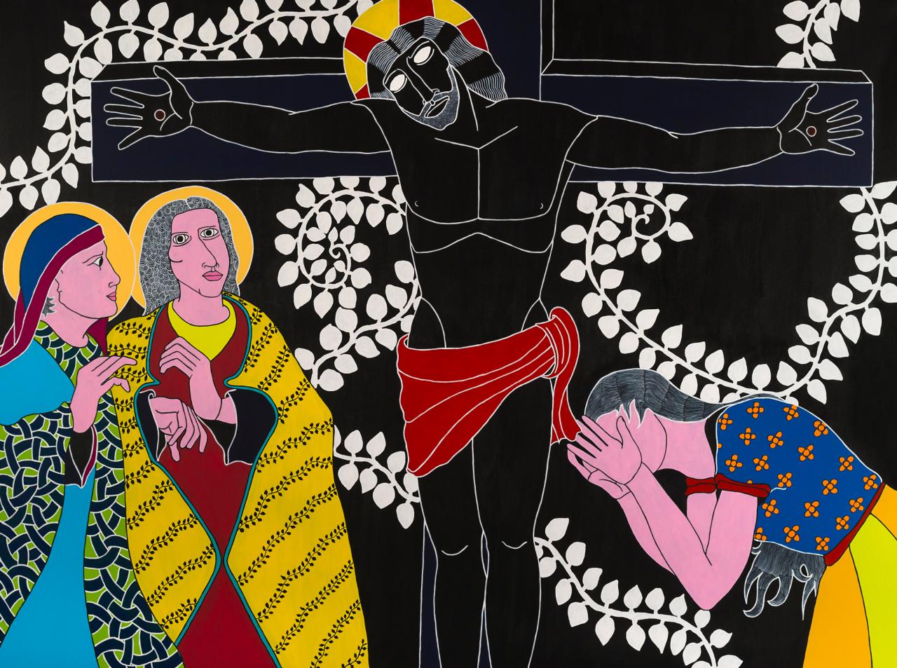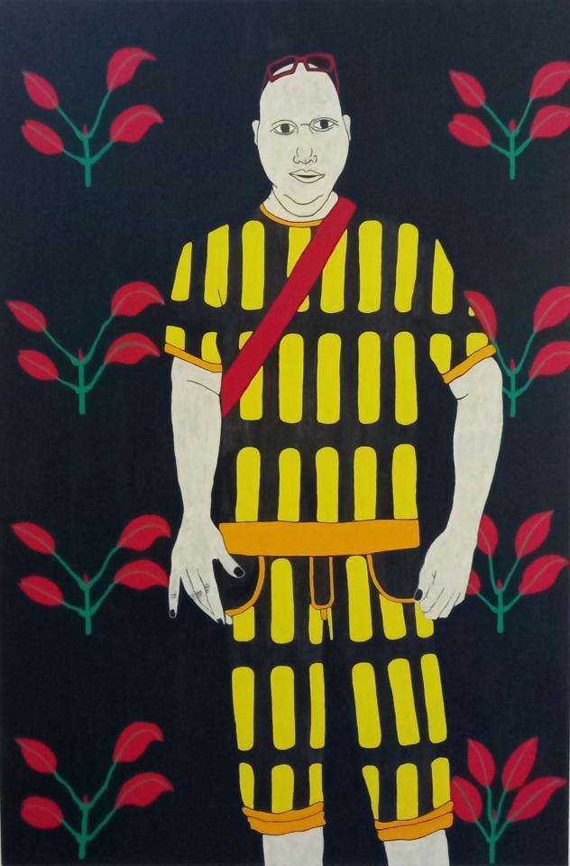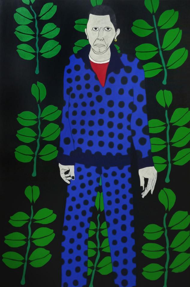 Très récemment, son retour à la peinture est passé par une histoire d’assemblage écologique et social. Kenkle peint des amis d’enfance ou des connaissances « de bar », comme il le précise, et appose des motifs de plantes endémiques de La Réunion en arrière-plan. La flore, les habitantes et les habitants de l’île ne sont plus qu’unité. Les titres des œuvres ne se réfèrent plus aux humains mais aux plantes qui sont représentées, et c’est ainsi que les « décors » supplantent les sujets supposés de la peinture. Cette évolution est en quelque sorte l’apogée des expérimentations que l’artiste mène depuis des décennies. En effet, si l’on observe ses premières peintures, dont Mascarine (2004), une évidence éclatait déjà ; le décor et le fond des peintures importent presque autant que les personnes représentées. Les motifs de second plan ont toujours été là, puisés initialement dans l’histoire familiale : dans les vêtements confectionnés par la mère de l’artiste, ou l’iconographie de la Bible – à laquelle il a largement rendu hommage avec Somin an krwa (« chemin de croix »). Aujourd’hui, c’est en pleine conscience que Kenkle imagine cette symbiose entre la nature et ses personnages ; ces histoires de peintures englobent l’histoire de l’île de La Réunion et surtout, bien au-delà, l’histoire et le positionnement de l’humanité par rapport à l’environnement.