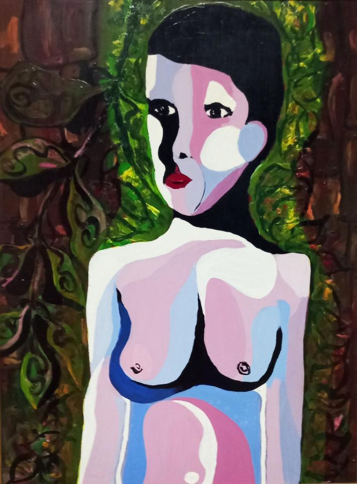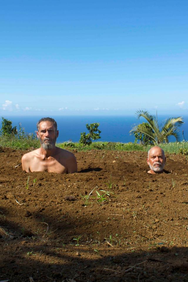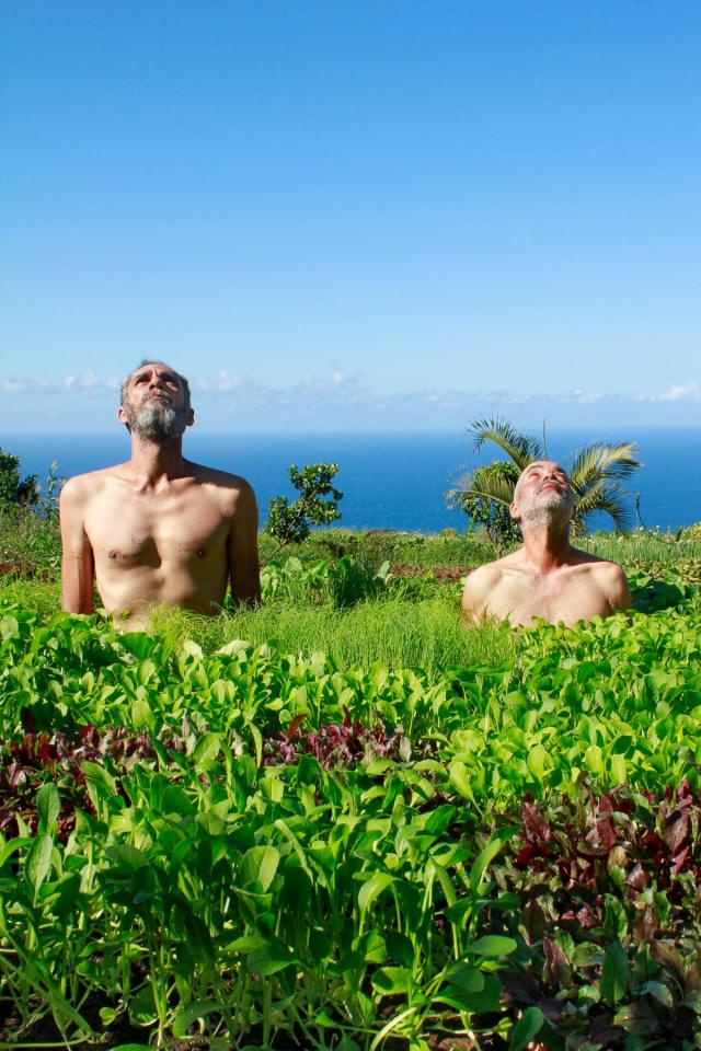 Kenkle expérimente depuis des années des méthodes alternatives de peinture. Il s’était aventuré déjà en 2008 avec l’artiste Cristof Dènmont dans le champ du spectacle vivant. Il s’agissait avec le collectif AléAAA de contribuer à une œuvre chorégraphique en rendant la peinture vivante. Avec de nouvelles interrogations, notamment autour de la place de la nature dans nos vies, Kenkle y est revenu très récemment avec la chorégraphe et interprète Soraya Thomas, pour une première de Krwazman au Théâtre sous les Arbres, au Port. Pour le duo, les corps et la flore se mêlent, et le matériau utilisé, de la bâche de paillage, est ambivalent : il sert à empêcher de façon naturelle la pousse des mauvaises herbes, mais est aussi constitué majoritairement de polyéthylène, un dérivé du pétrole, évidemment dangereux pour la nature. À partir de 2019, les recherches de Kenkle sur l’art s’avèrent parfois encore plus radicales et notamment influencées par la pensée de Philippe Descola, cherchant avec lui à montrer que la distinction entre nature et culture n’est pas universelle, mais plutôt une construction sociale et culturelle variable. Depuis janvier 2019, avec son ami artiste Kako, il développe la « Kour Madam Henry » à Montvert les Hauts (La Réunion) et s’éloigne de la peinture. Ensemble, ils cultivent une parcelle anciennement dédiée à la culture intensive de la canne à sucre afin de la rendre à la nature et de produire des légumes biologiques. Ce terrain de jeu devient une sorte de toile, un nouveau moyen d’expression qui pourrait rappeler certaines pratiques conceptuelles ou du land art, mais aussi les recherches du paysagiste Gilles Clément et son « jardin en mouvement ». Il s’agit d’un retour à la terre, d’une période pendant laquelle créer n’est plus synonyme d’objet mais de vivant. Les deux artistes, qui ont rédigé un manifeste à leur projet, introduisent leur texte avec une citation du sociologue Edgar Morin : « Nous avons besoin de vivre dans des petites oasis de vie et de fraternité. » Ce choix apparaît très révélateur de l’intention, car Edgar Morin, bien que n’ayant pas spécifiquement centré ses travaux sur la nature, propose une approche de la pensée complexe, interdisciplinaire, et axée sur les relations entre les éléments. Cette perspective s’applique de manière pertinente à l’écologie dans la reconnaissance de l’interconnexion et l’interdépendance des divers éléments d’un écosystème. Ainsi, ses idées offrent un cadre conceptuel pour aborder de manière holistique l’étude et la préservation de la nature. C’est dans cette logique que Kenkle utilise alors la photographie et met en scène des autoportraits avec son camarade Kako. Dans des situations incongrues, parfois amusantes, le duo se fond dans la flore et la production agricole qui résulte de leur labeur dans les champs. Des brèdes et des salades deviennent des personnages et nourrissent l’obsession de l’artiste pour le portrait. Le vert est omniprésent et luxuriant.