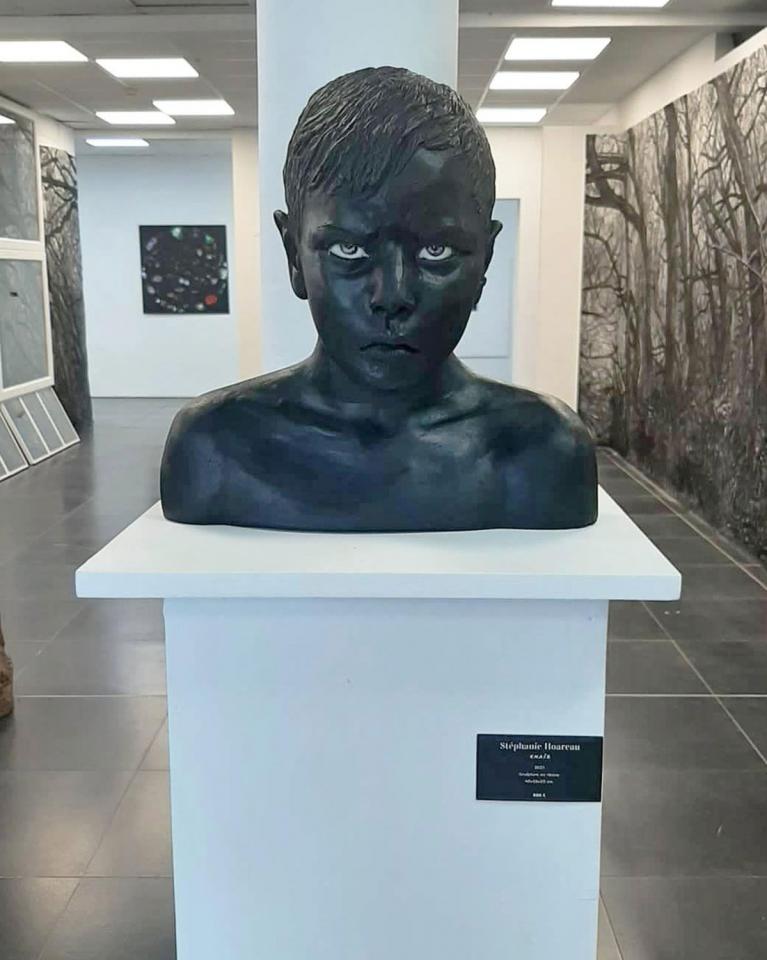 Cette tendresse envers l’enfance s’entérine dans la sculpture Khaïs (2021), un buste noir en résine qui renvoie à la sculpture officielle. Cependant, le jeune garçon représenté ne correspond pas aux attentes d’un tel canon. Il s’agit d’un membre de la famille de l’artiste, dont elle a représenté la colère. Son regard est perçant, son front plissé. Au sein d’une tradition très conventionnelle, Khaïs propose, au contraire, de reconnaître en la colère des enfants une forme de magie incantatoire ou peut-être une forme de communication. Sans doute les deux.