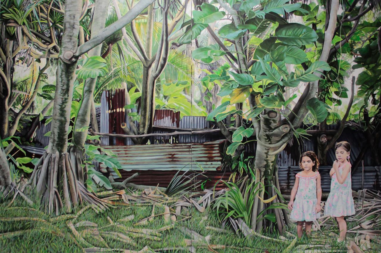 La peinture Les sœurs (2020) ne marque plus un lieu connu, mais l’appartenance à un héritage socionaturel, associant vie humaine et vie végétale. Deux jeunes filles se trouvent au sein d’une forêt luxuriante, presque oppressive dans sa luminescence verte montagnarde. L’une d’elles ressemble à l’artiste ; justement celle qui regarde le·la spectateur·rice, avec cette expression aussitôt ennuyée lorsqu’on remarque être pris·e en photo. Parmi les arbres, une maison en tôle délabrée, ruine de ruines, ou bien une clôture. Mais surtout, une fluctuation sociale s’y présente. Les deux petites filles sont habillées avec la même robe, tradition bourgeoise s’il en est, dans un contexte socio-économique ambigu, difficile à comprendre pour celleux qui n’habitent pas l’île, qui se partage, comme dans le stupéfiant roman Summer (Edith Wharton, 1917), entre les habitant·es d’en bas et les habitant·es d’en haut, de la montagne – les pauvres, les métis·ses, et toustes celleux qui ont la peau brune ou noire, et dont les mœurs sont considérées comme abjectes. L’image est équivoque : les enfants appartiennent-elles ou pas à cette richesse pauvre des montagnes ? Elle déconstruit les binarités, suggérant que, comme pour les parents de Stéphanie Hoareau ainsi que l’artiste elle-même, les identités sociales sont faites, elles aussi, de couches contradictoires, d’aspirations et d’abymes.