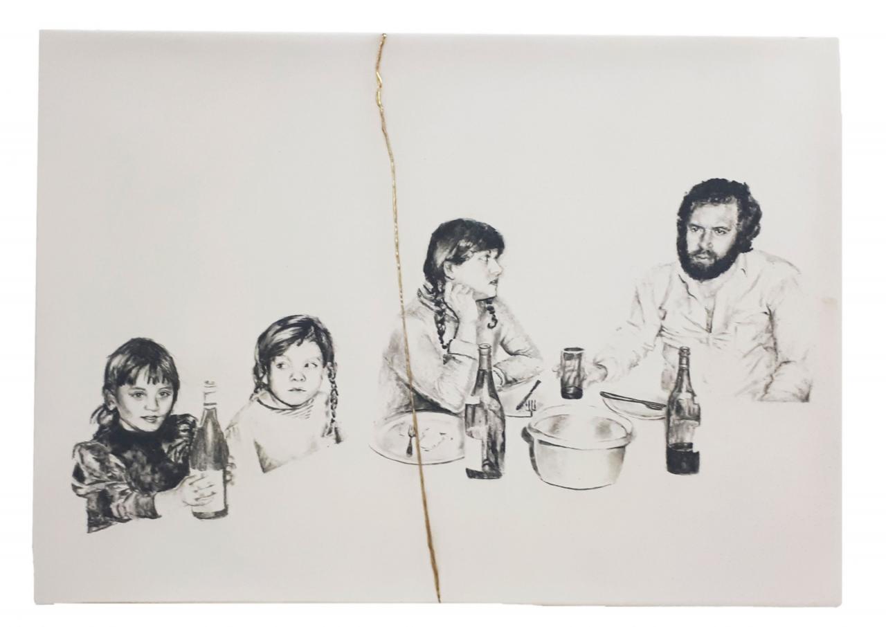 Plus complexe encore, et tout aussi personnelle, est la série des Dessins de famille (2018), un ensemble de dessins sur feuille en céramique, dont le trait est « complété » par la cuisson, car on ne sait jamais comment celle-ci l’altérera. Il y eut dans ces œuvres comme un lâcher-prise de la part de l’artiste, qui laissa le dessin se faire lui-même, comme si elle imitait le processus analogique de développement de l’image dans cette « recette » astucieuse. En effet, pendant son enfance, on allait encore récupérer les photographies de famille pour les découvrir a posteriori, comme un souvenir décanté. Toutefois, il se trouve que Stéphanie Hoareau a perdu pratiquement tous les clichés pris par ses parents en raison d’un cambriolage, puis du déménagement. Ce n’est qu’en 2017, déjà adulte, avec une pratique artistique développée, qu’elle découvrit chez sa tante un ensemble de quatre cents photographies prises par son oncle – des repas, des sorties et des fêtes familiales. Elle s’en empara pour faire cette série, dont chaque image est composée d’une ou plusieurs scènes qu’elle a abstraites des images, puis retravaillées.