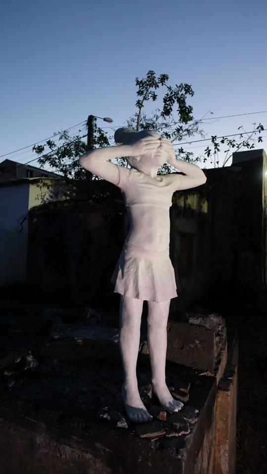 L’enfance est un moment de prédilection pour l’artiste, puisque c’est là que, pour elle, beaucoup de questions et de réponses se sont cristallisées : la peinture, l’imaginaire, le jeu, aux côtés de la perversion du monde adulte. La complexité d’une expérience de mal-être prolongé tient au fait que, parfois, il s’y trouve un langage, une issue à portée de main, qui nous sauve. L’enfance préservée par elle-même. Les sculptures Cache-cache et Joueur de monde (2021), toutes deux en résine blanche (plasticrète), représentent deux enfants, une fille et un garçon, dans des positions différentes : la jeune fille joue un jeu qui l’expose, cache les autres à sa vue et sous-entend ainsi une vulnérabilité inquiétante, tandis que le garçon s’applique à un jeu de billes avec des lumières LED, brillant dans la nuit comme des planètes, qu’il manipule tout en cachant quelque chose dans une main fermée derrière son dos. Ces pièces placent dans l’espace public les jeux transitoires des enfants, les chargeant ainsi du regard de l’adulte, de la communauté. Car souvent, le monde de l’enfance est dans les interstices du réel et de l’imaginaire, à peine perçu ou même compris. Les rôles sont genrés et soulignent le pouvoir à venir – ou pas.